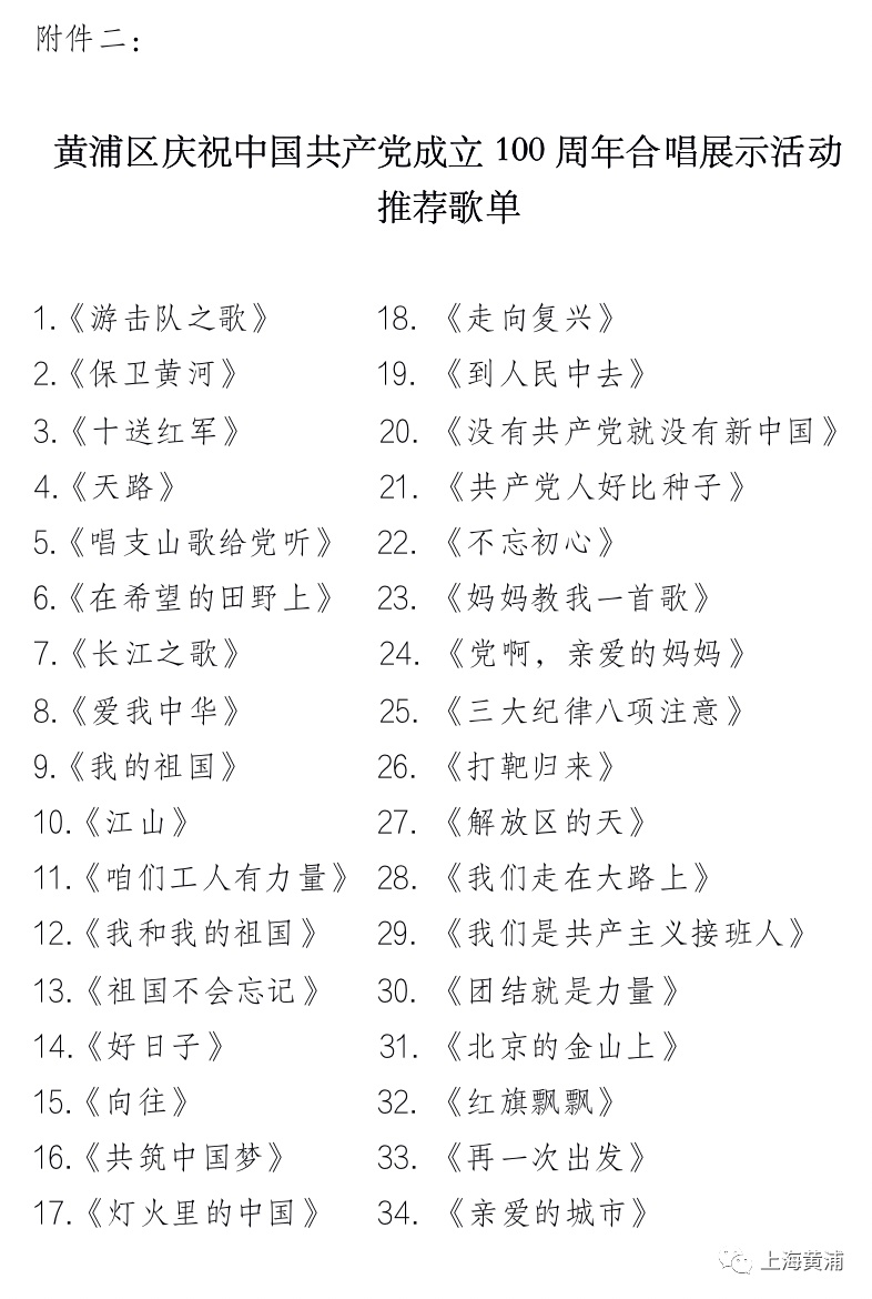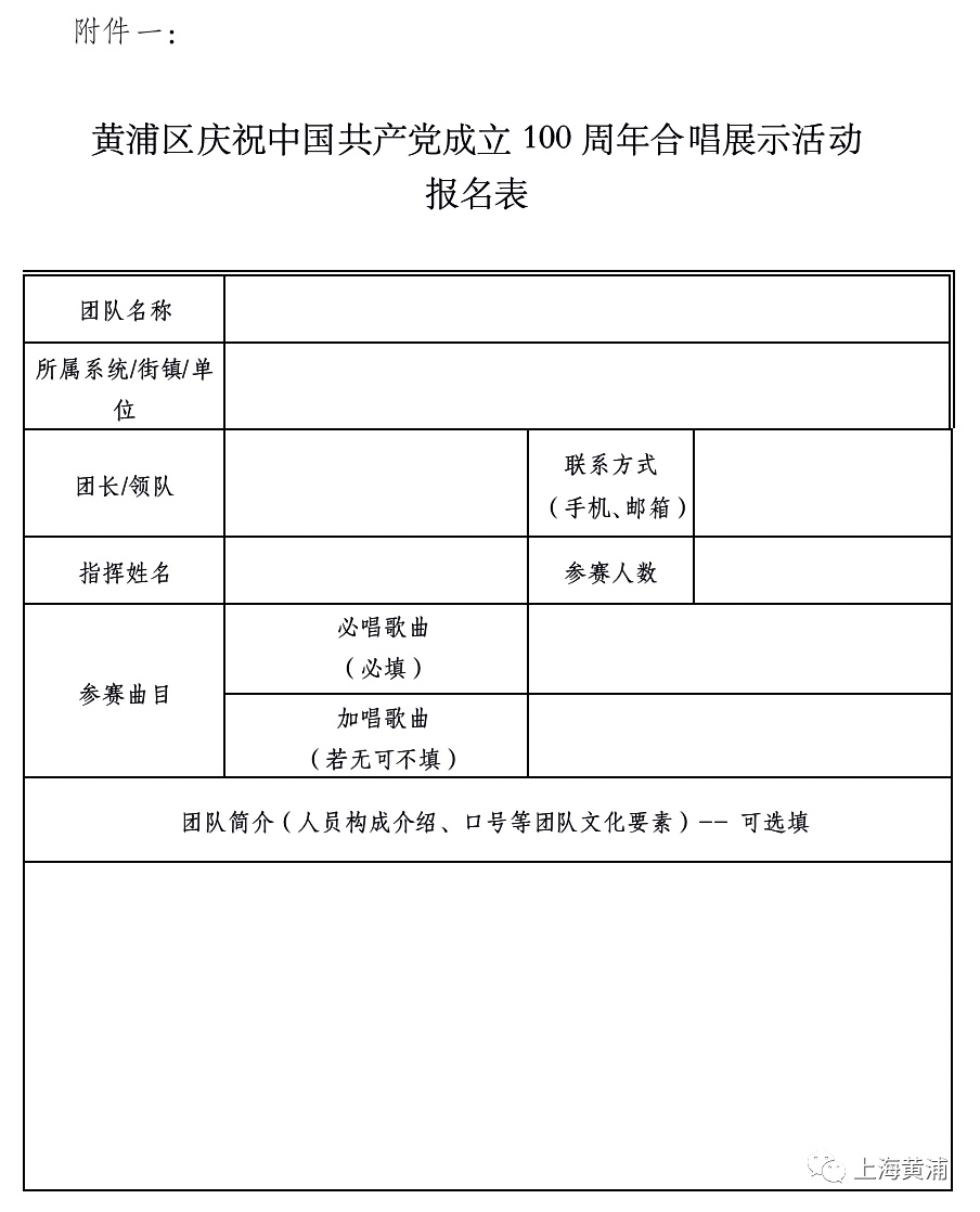 为隆重庆祝中国共产党成立100周年,大力唱响共产党好、社会主义好、改革开放好、伟大祖国好、各族人民好的时代主旋律,展现全区广大党员、群众不忘初心、牢记使命,开拓奋进、攻坚克难,为全面建设社会主义现代化国家、夺取新时代中国特色社会主义伟大胜利、实现中华民族伟大复兴的中国梦而继续奋斗的精神风貌,黄浦区将举办“百队红歌·‘咏’动新时代”庆祝中国共产党成立100周年合唱展示活动,现向区域内机关、人民团体、企事业单位、学校、社区、驻区企业及社会各界征集参加展示活动的合唱团队。