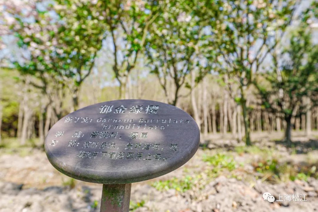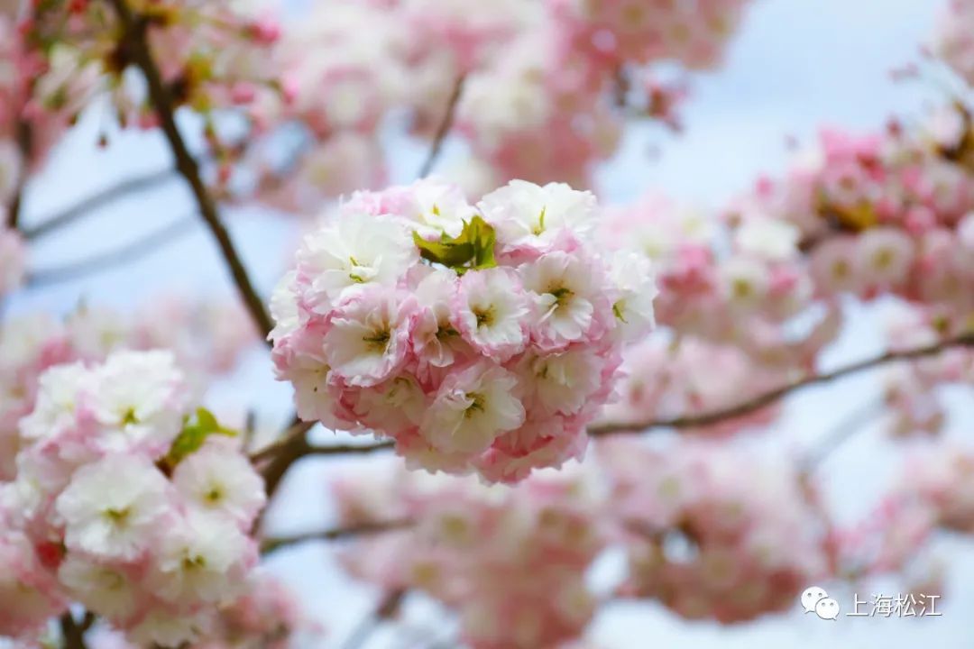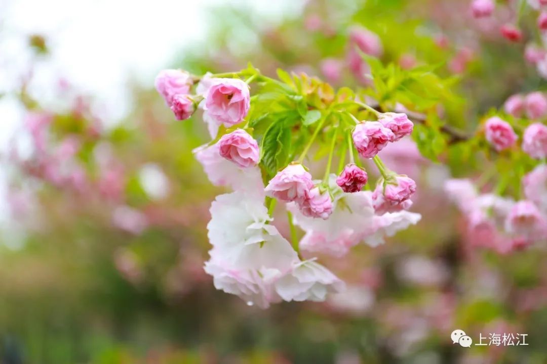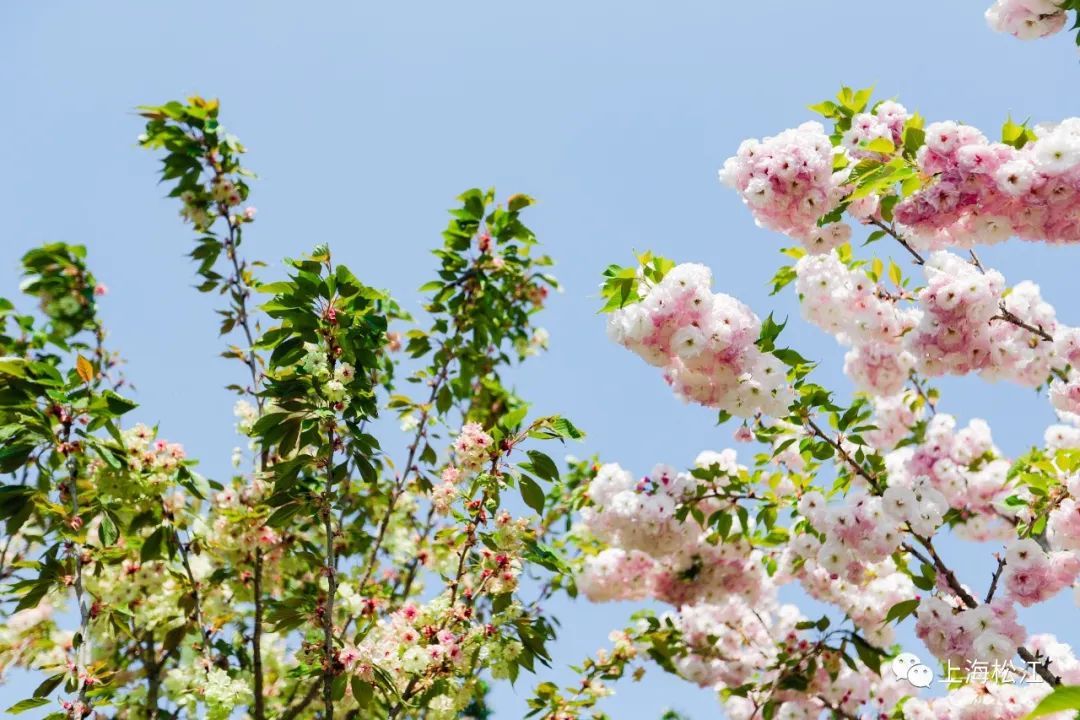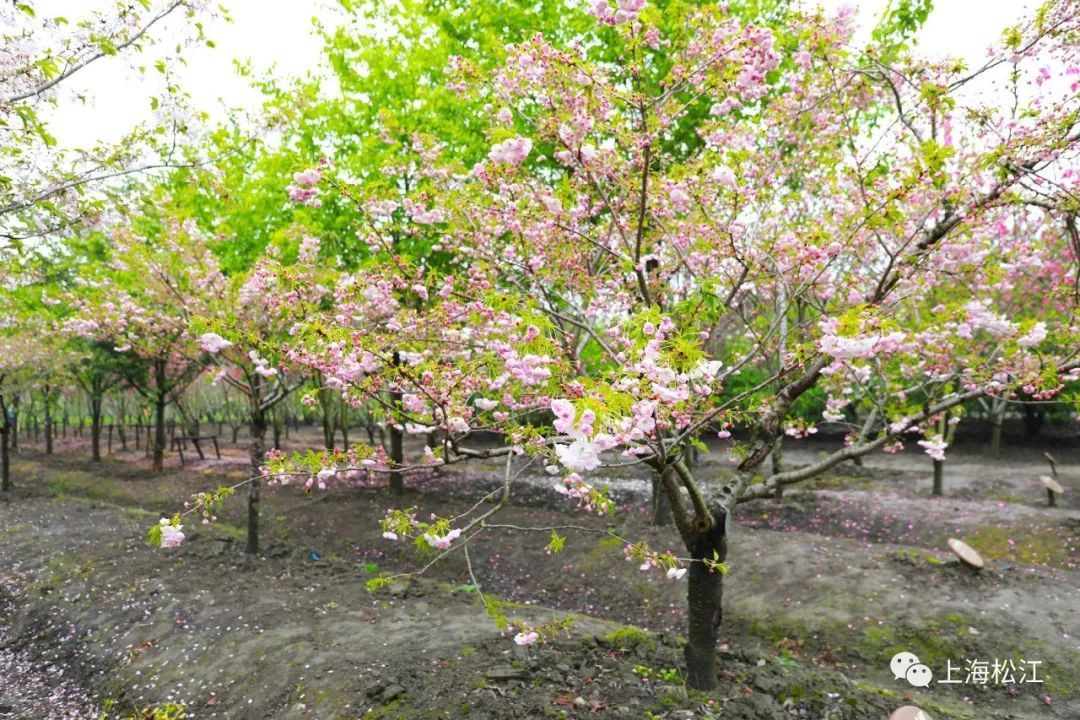 在广富林郊野公园西南角,月季花廊附近,种植了关山樱、松月樱、一叶樱等多个晚樱品种。眼下,这些樱花正值盛花期,形成了一片粉色花海。