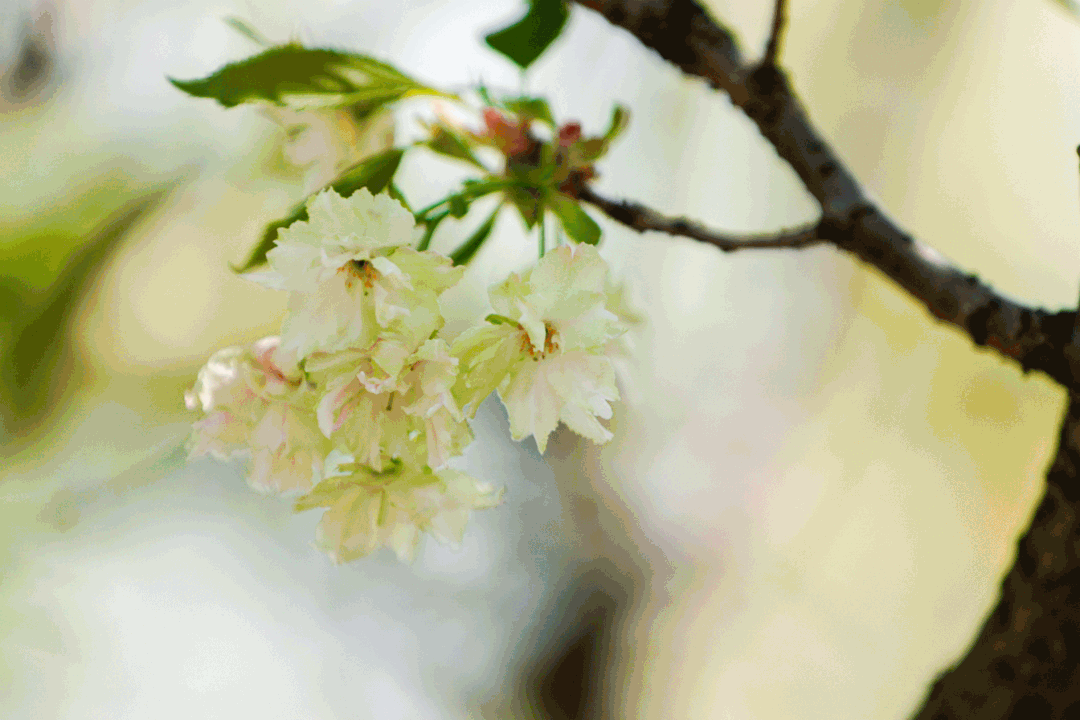 跟常见的粉红色晚樱不同,它的花是浅绿色的,好似抹茶蛋糕的颜色。更神奇的是,郁金绿樱的颜色还会随着花期有一个渐变过程。开花初期,绿色会特别明显,到了中晚期花蕊部位会变成红色,而花瓣会呈现通透的黄白色。