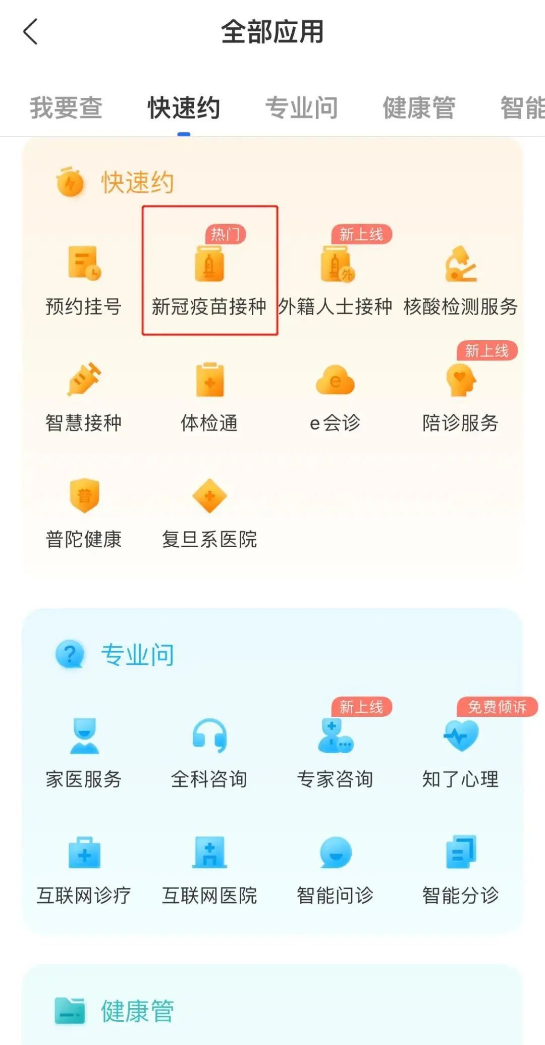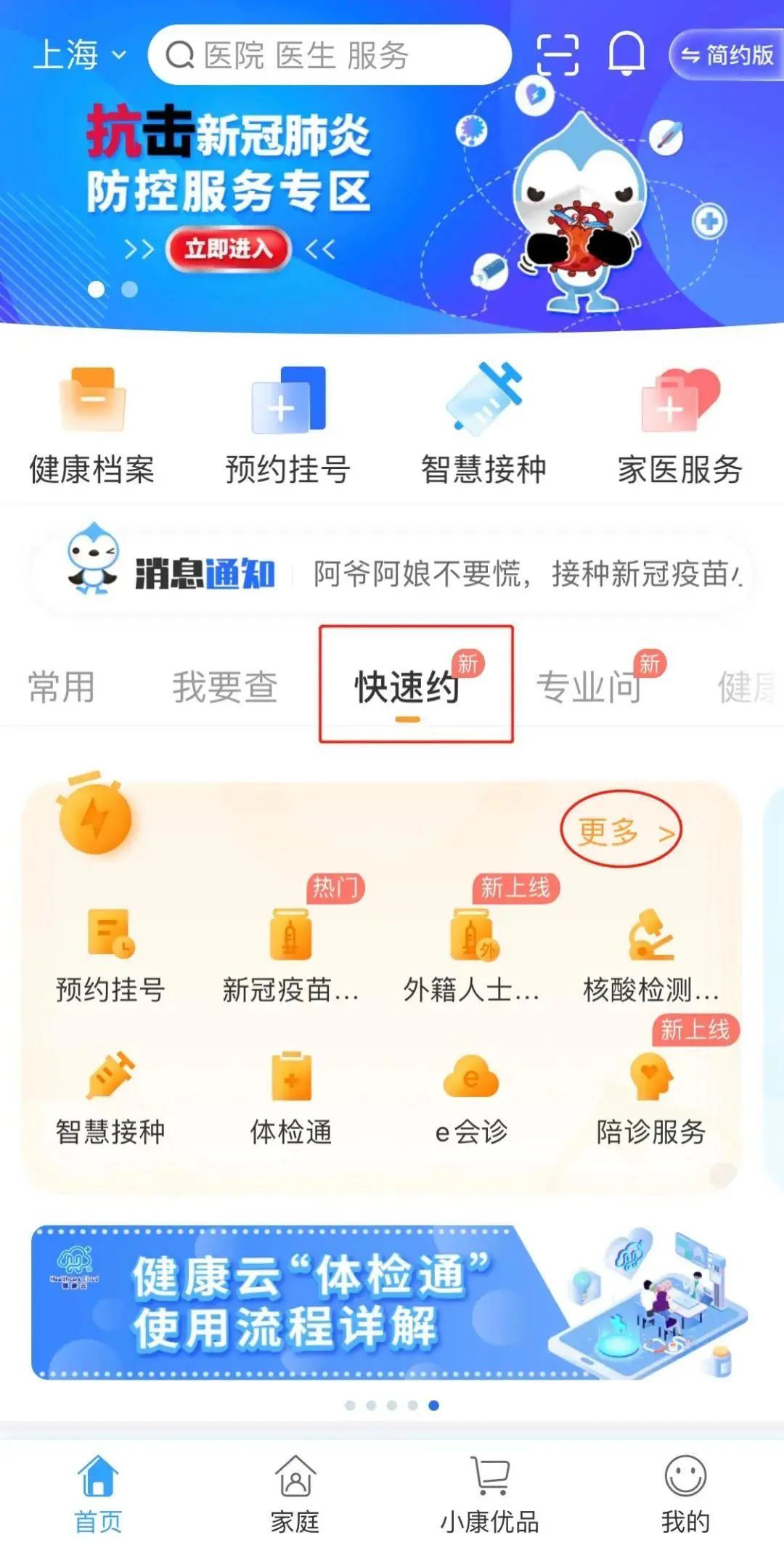 1、打开“健康云”APP,在首页中找到“快速约”栏目,选择“更多”,点击“新冠疫苗接种”。