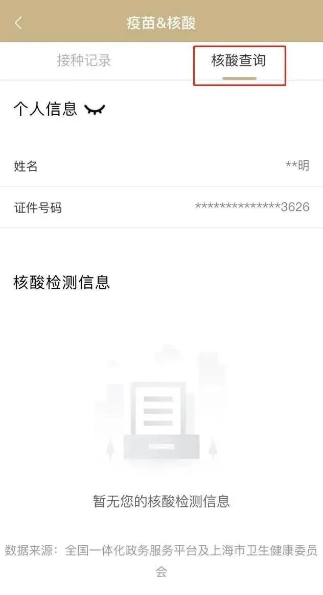 3、点击“接种记录”页旁边的“核酸查询”,即可切换至核酸查询页面,查询您的核酸检测结果,若无核酸检测记录,则查询不到相关信息。