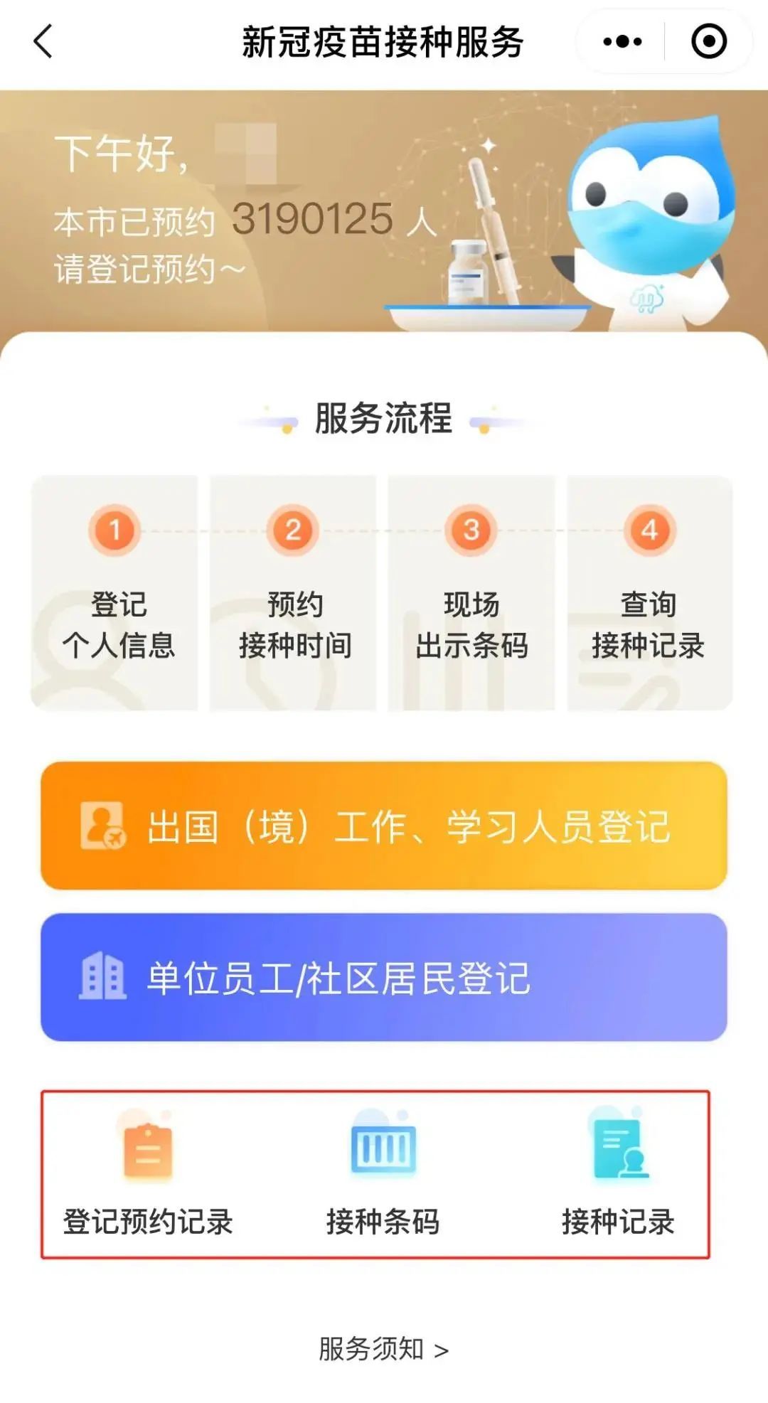 2、进入服务页面,即可直接查看“登记预约记录”、“接种条码”、“接种记录”。