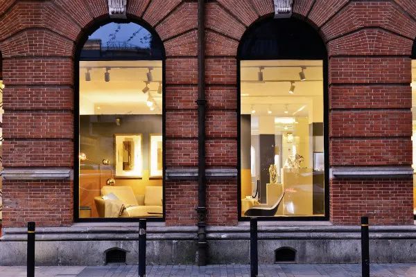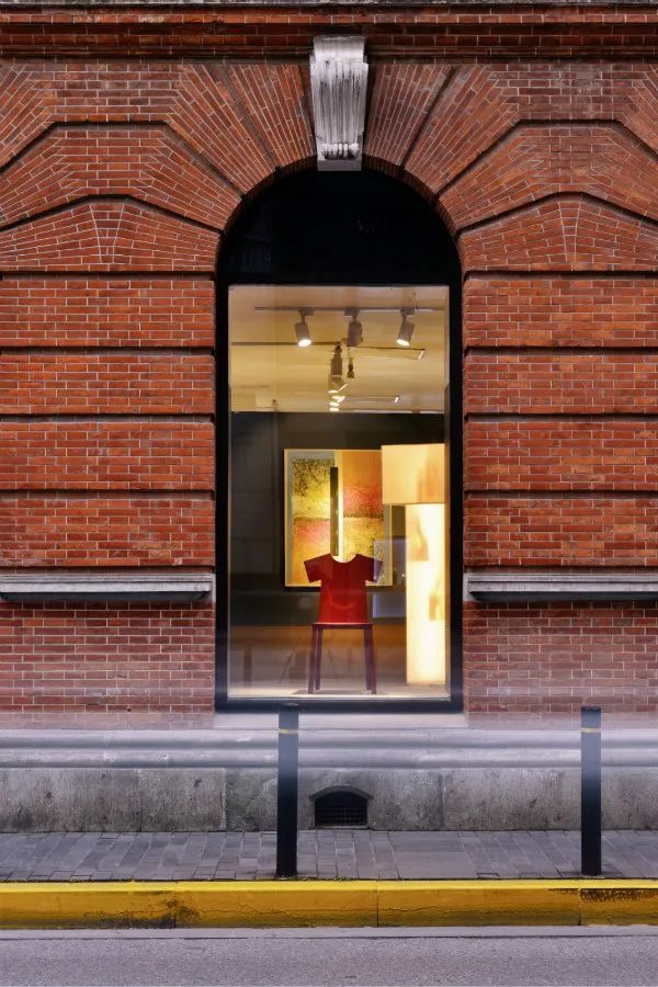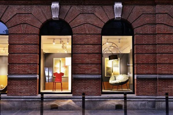 橱窗部分使用到了红绿撞色,大胆的色彩结合创意造型的家具,与古老的建筑外观形成对比,带来富有冲击力的视觉体验。