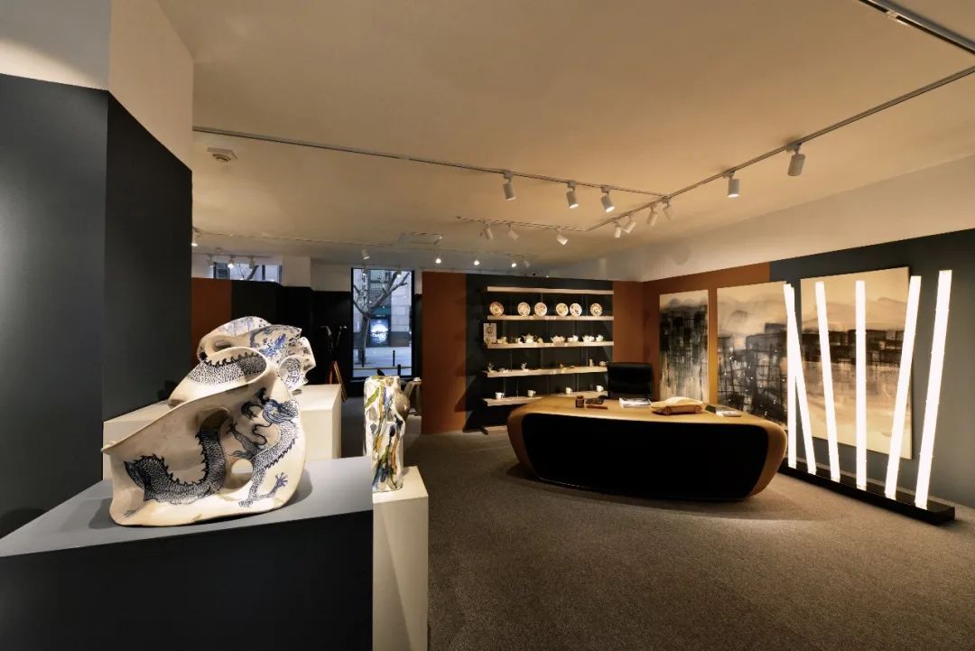 展厅中央位置放置了当代陶瓷艺术家孔祥希的花瓶作品,潜心于景德镇学习古老陶瓷技艺的他,全面汲取中西方艺术养分,拥有独特的审美表达。《对话》系列以园林中的太湖石为灵感,极尽展现“虚实”之美。