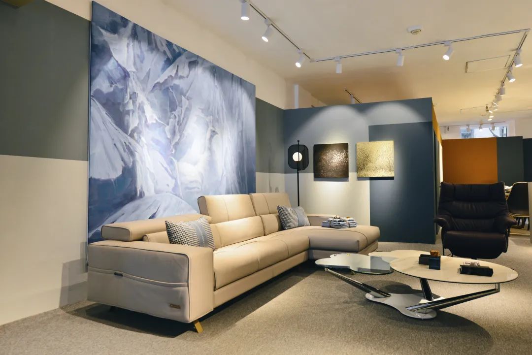 Gatsby空间致力于实现美学与功能间的平衡,可旋转拉伸的花瓣茶几,多功能音响电视柜以及可调节不同倚靠角度的模块化牛皮沙发,引领舒适休闲的生活体验。