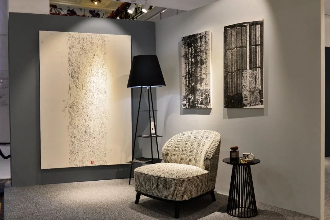 中国新锐书法家与画家的作品穿插于不同风格空间的墙面,与意式美学相融合,迸发出独特强劲的力量。雷玲的《若要观云月》工笔画悬挂于千鸟格扶手椅之上,注入浪漫诗意的气息。
