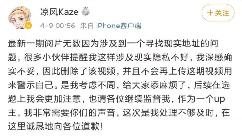 4月9日凌晨,“凉风Kaze”在B站动态和个人微博发布道歉,表示自己感到视频内容不妥,“因此删除了该视频,并且不会再上传这期视频用来警示自己”,后续会在选题上更加注意。