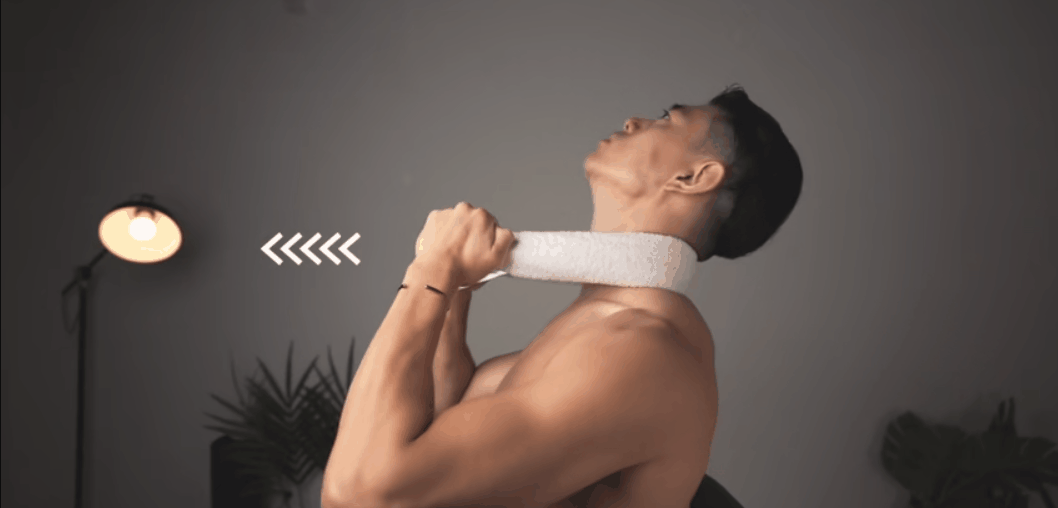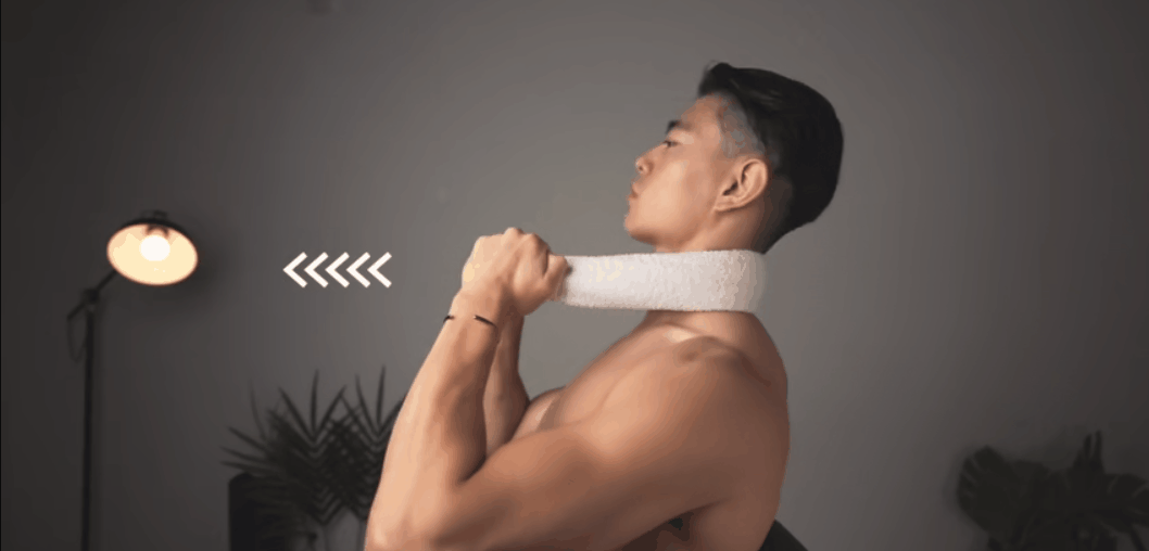 为了缓解这个问题,可以找一块毛巾,放在脖子后面,然后向前拉直。保持向前拉直张力的同时,慢慢向后仰头,当把头放下来的时候,做收下巴的动作,持续3秒。做十五到二十次。