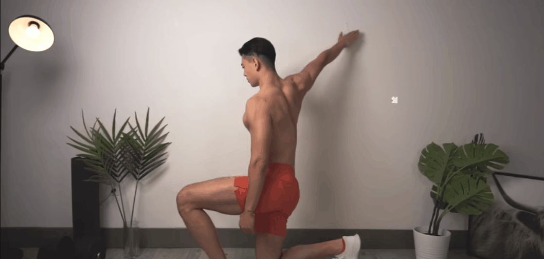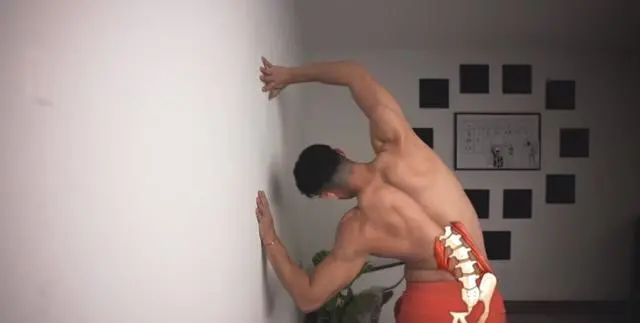 首先,身体靠墙,做弓箭步的姿势,靠墙一侧的臀部需要向前顶住收紧,同时髋屈肌呈现一个拉伸的状态,然后将一侧手臂靠着墙面,顺时针画圈,画到起始位置后,再逆时针还原回复到起始位置。