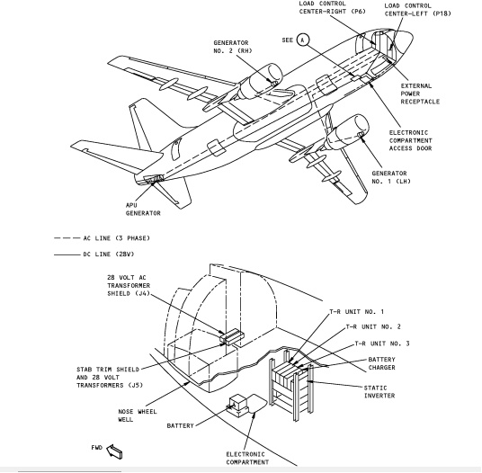 波音737某一型号的电力布局图示(所示仅为部分,其电气系统实际上复杂得多)