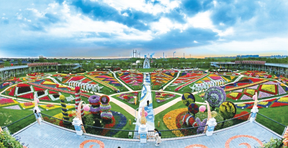 在园艺名师的精心雕琢下,这里的每个角落都可与大自然的美好和谐统一。从空中俯瞰,近2万平方米的奇迹花毯好似开屏的孔雀,上万株各个品种的郁金香,包括重瓣、饰边郁金香,百合花型郁金香,黑郁金香等,经过精心设计,用不同色彩、造型布局出孔雀的羽毛形状。大面积的花海随着地形的高低绵延起伏,唯美浪漫。