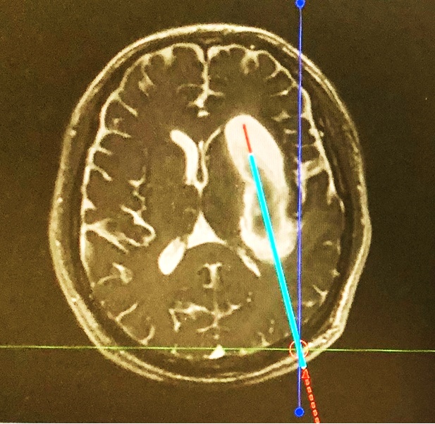 经过精密的术前准备与讨论,侯立军主任根据独创的国际创新理念与术式,为老杨实施了机器人辅助下枕部入路颅内血肿穿刺引流术。手术机器人的机械臂经过精准的计算与术前计划,准确的避开功能区,穿刺到达血肿,将血肿完全吸除。整个手术过程仅半小时,出血量微乎其微。