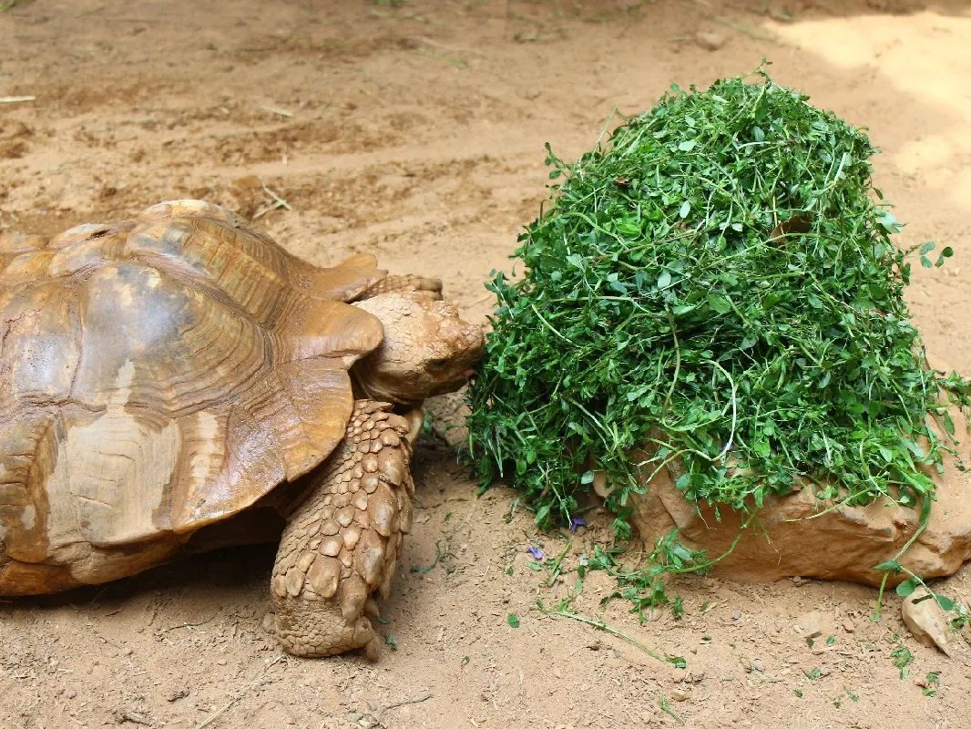 苏卡达陆龟真有口福,那么多野草可以享用!