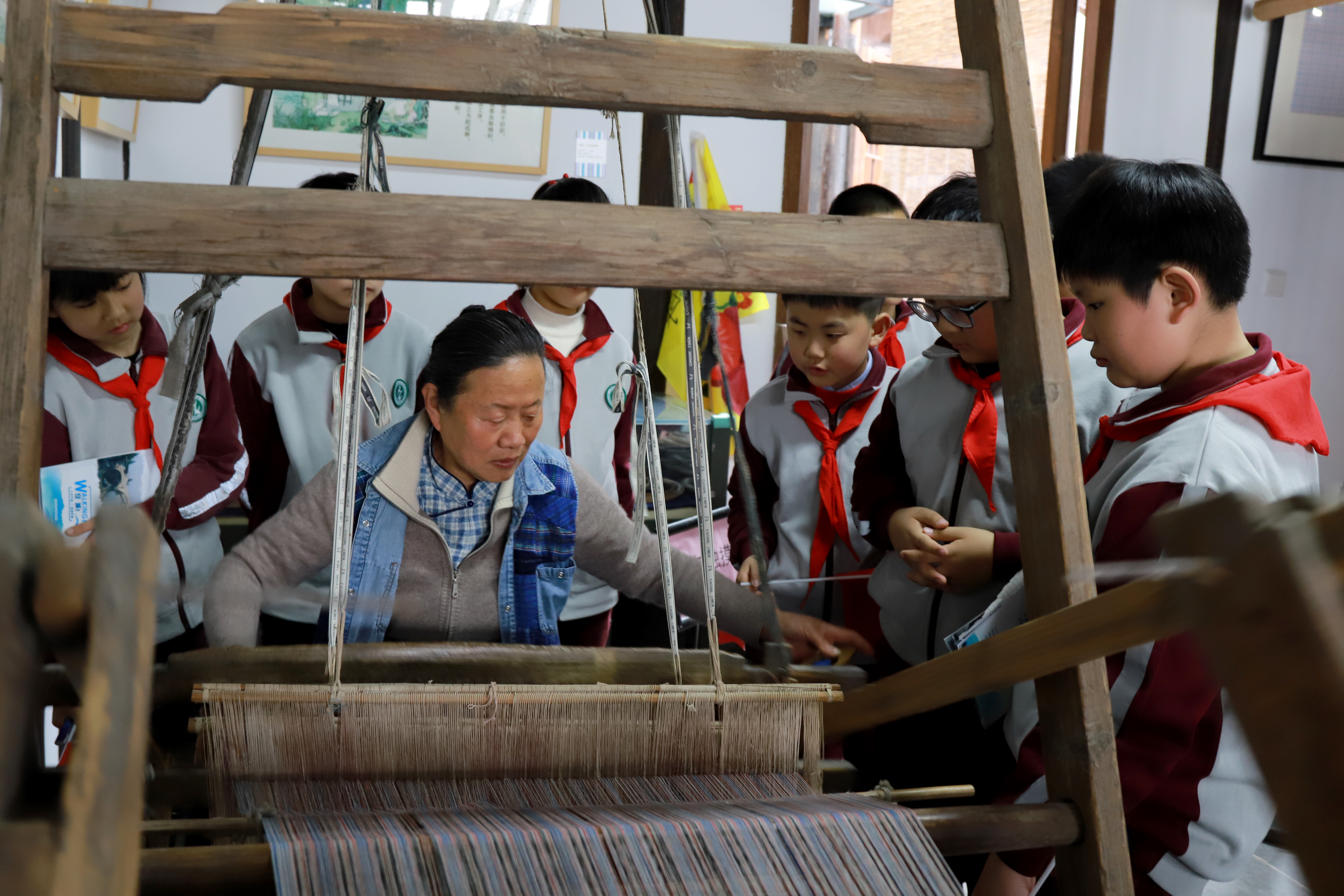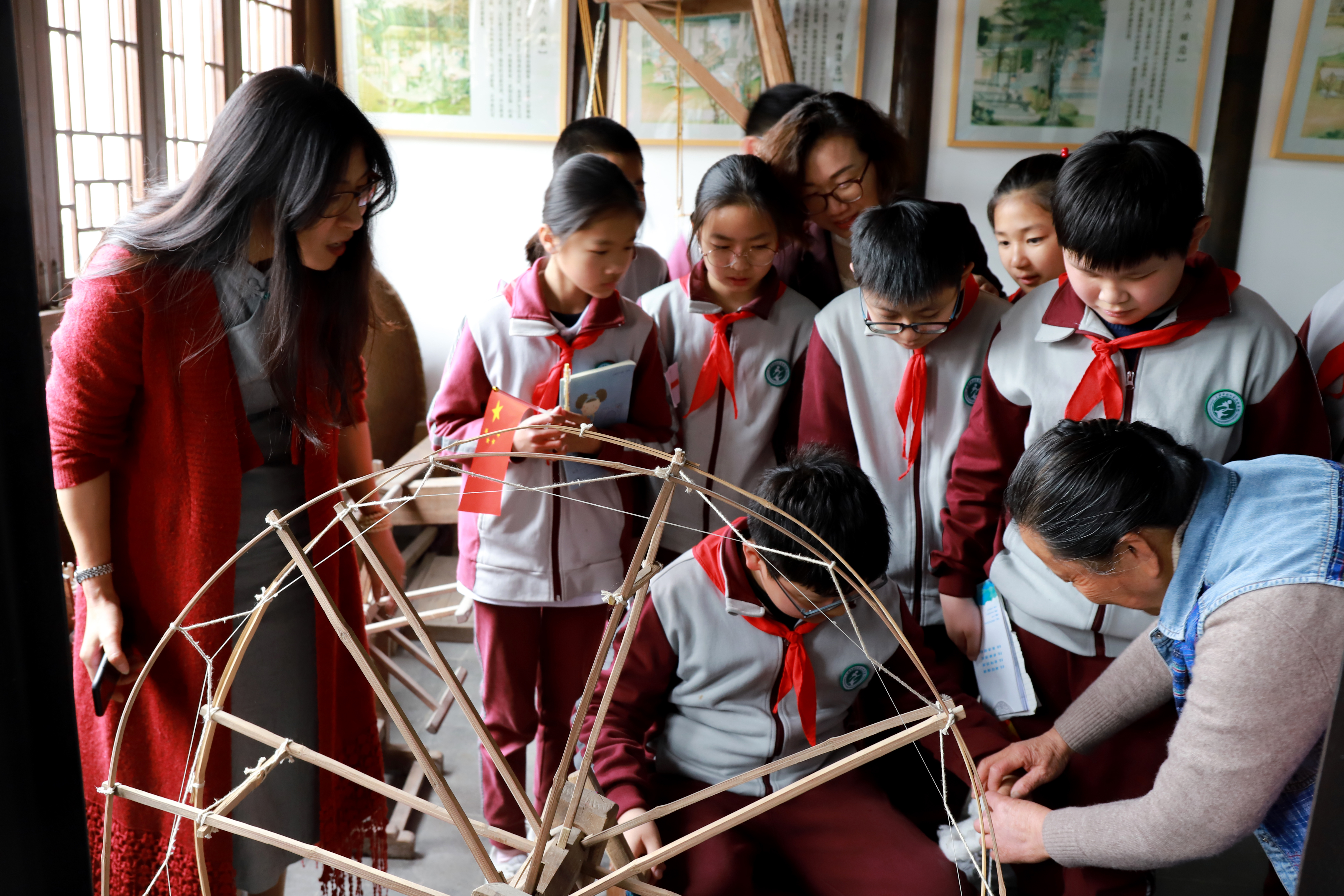 坐在云间第一桥的跨塘桥上,学生们仔细了解着跨塘桥的历史变迁,聆听陈子龙投河殉国的壮烈故事。随后开展拓展课,实验桥梁承重,在动手过程中感叹古人造桥的智慧。在大仓桥边,学生们遥想昔日永丰大粮仓的繁华景象,“永丰,永远丰收,这个地名与昔日的漕运文化密不可分。”学生们走进松江布展示馆,了解松江布文化,近距离观摩纺纱机、织布机等纺织工具。在学校劳技教师的指导下,学生们动手实践,用松江布制作香囊。在张氏米行,学生们还体验了做米糕、打糍粑、磨豆浆。