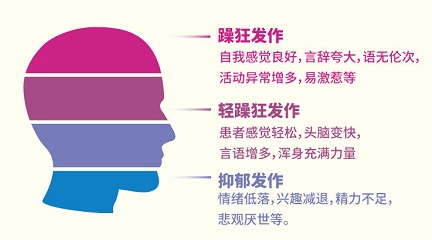 抑郁发作期的患者,可出现抑郁症的种种表现,如:情绪低落、兴趣减退、沉默寡言、精力不足、悲观厌世等。轻躁狂或躁狂发作期,患者的情绪和行为会到达另一个极端。症状轻即轻躁狂发作时,患者感觉精力充沛、头脑变快、周身充满力量。躁狂发作时,患者活动异常增多,不停忙碌,难以入睡。讲起话来过分夸大、滔滔不绝,严重者语无伦次。做事冲动、不计后果,比如大笔挥霍钱财,甚至置自身与危险之中,严重的还可能出现妄想和幻觉等症状。