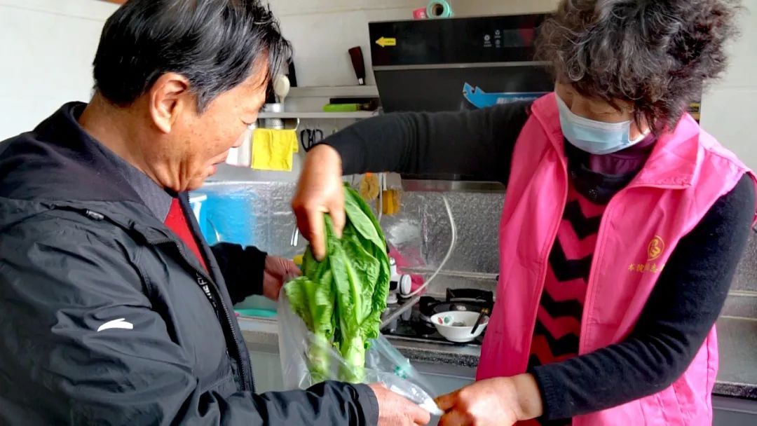 “老戴,你在家吗?给你送蔬菜来了。居委组织了共享菜园以后种的。”78岁的独居老人戴老伯前段时间不慎摔了一跤,造成腰部骨折。经过一段时间的治疗和休养,已基本康复,但是俗话说“伤筋动骨100天”,戴老伯现在只要站的时间一长,就会感到不适,更别说外出行走买菜了。因此收到志愿者送来的新鲜蔬菜时,他高兴不已。“欢迎,这怎么会不欢迎,这都是为老人服务。这个菜最新鲜了,地里摘起来就马上送过来了,你看莴笋的汁都还在。”