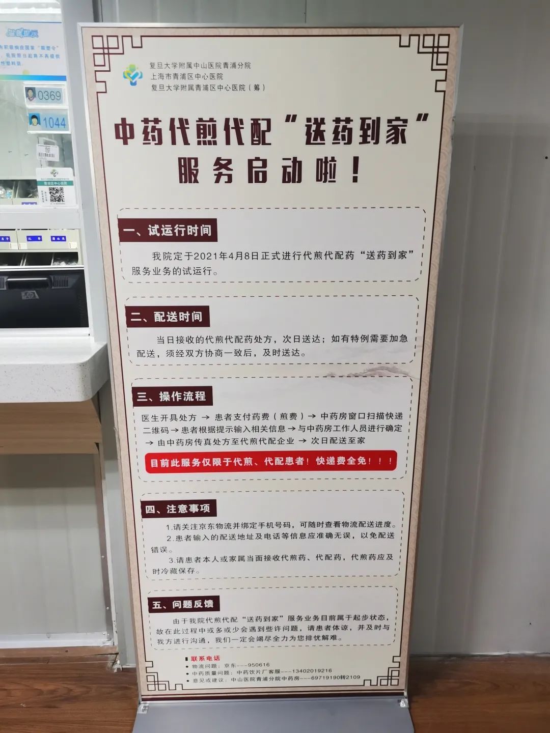 近日,复旦大学附属中山医院青浦分院在中药汤剂代配代煎的基础上,推出了免费“送药到家”服务,实现了患者少跑腿,服务再升级。