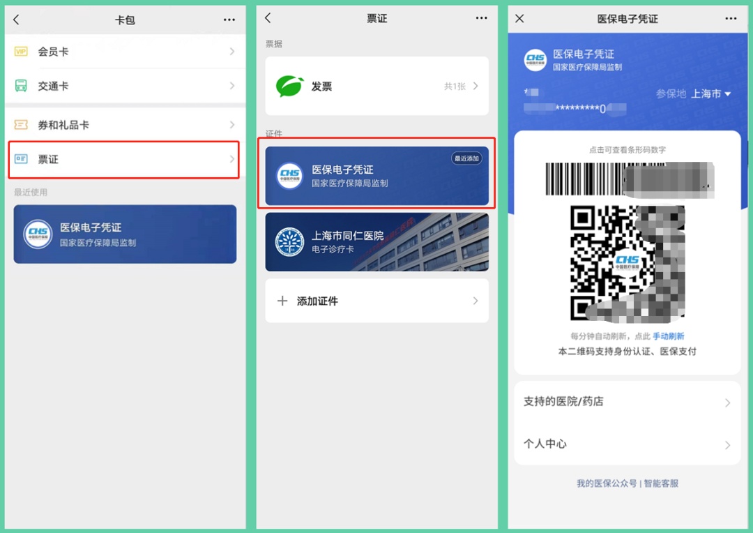 2、进入微信→卡包→票证,选择医保电子凭证,出示医保电子凭证二维码,即可扫码取药。