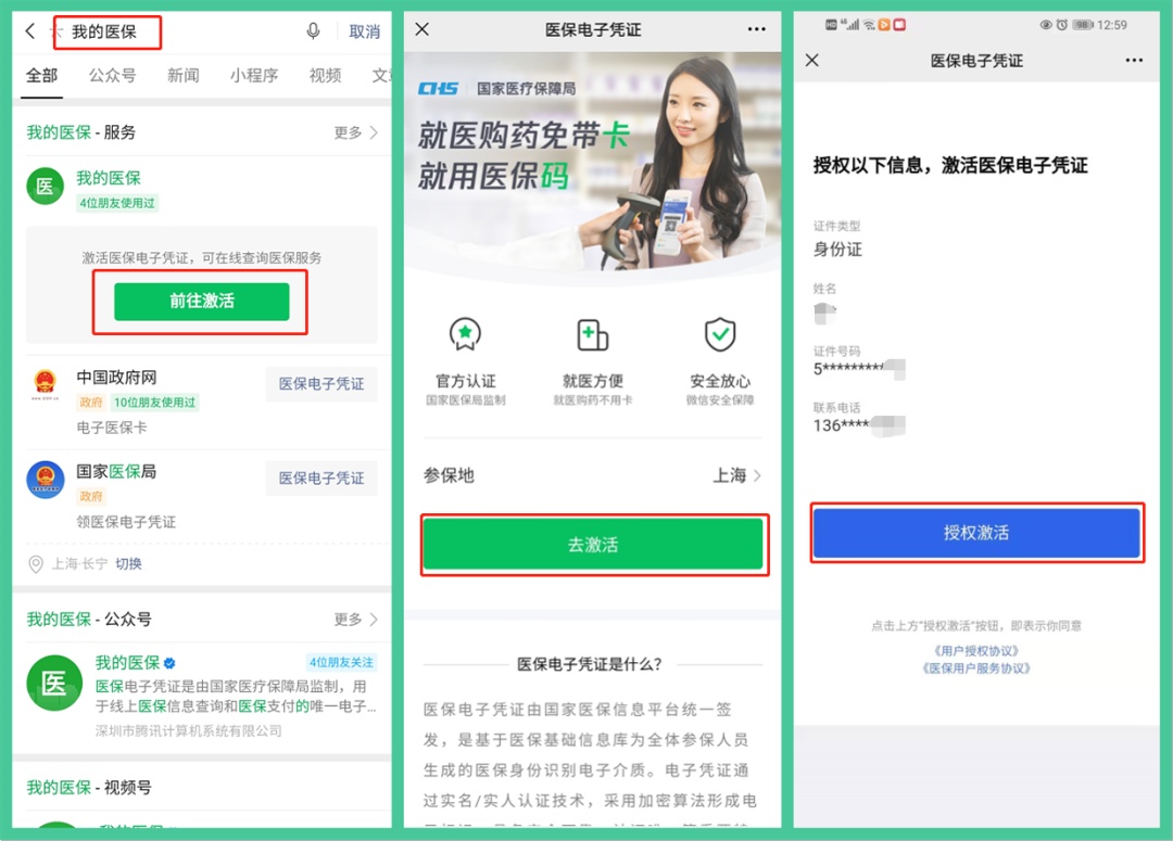 1、在微信中搜索【我的医保】,按提示在微信中授权激活医保电子凭证。