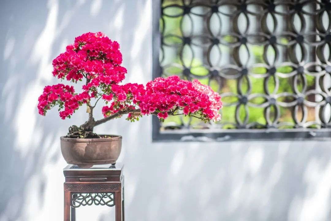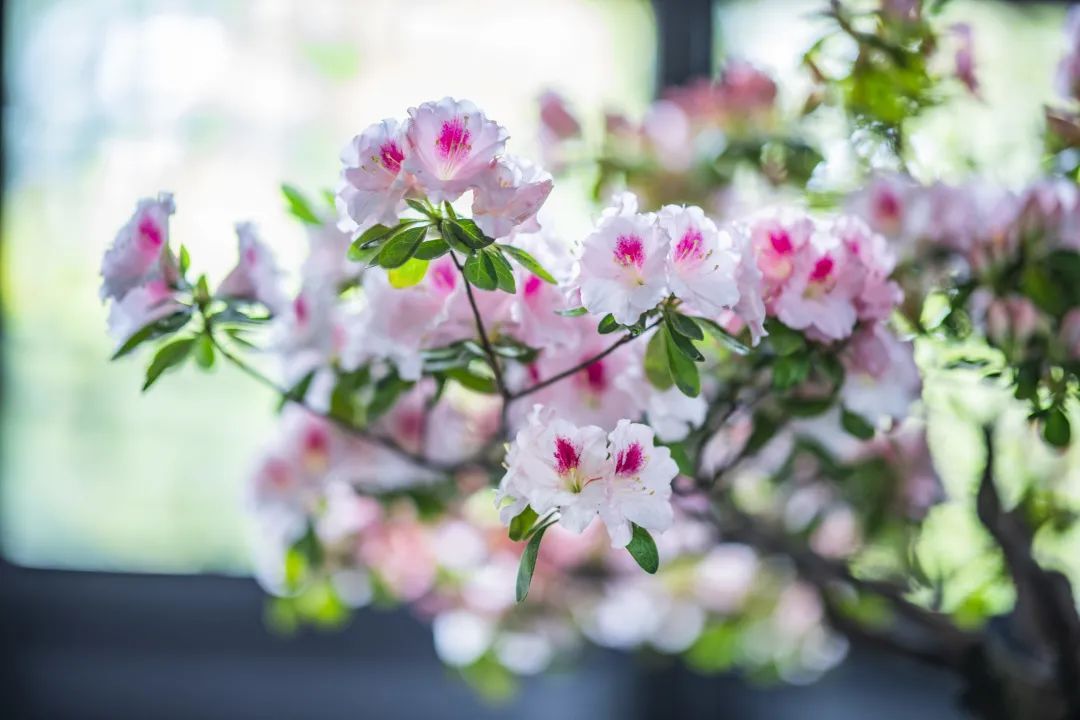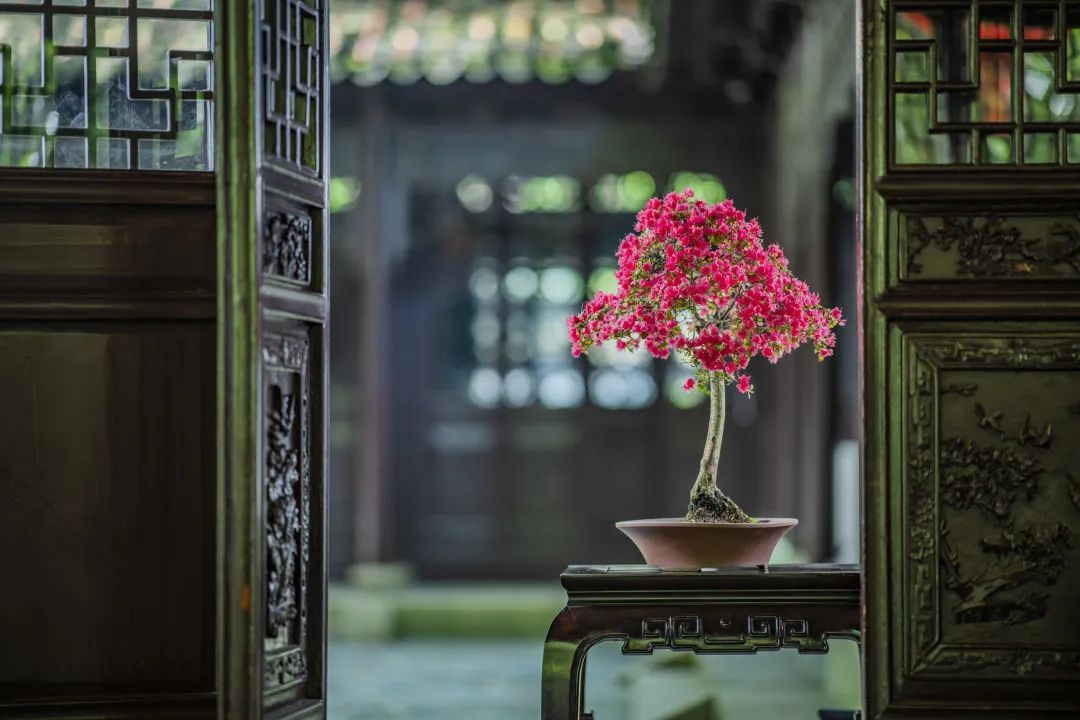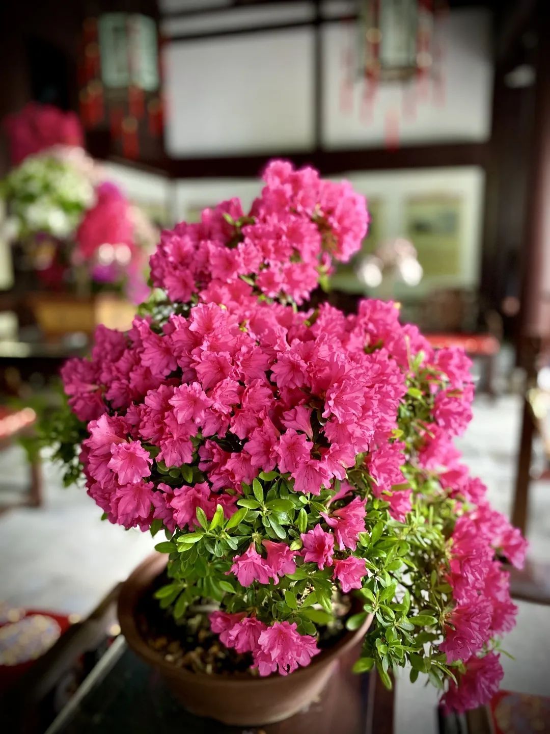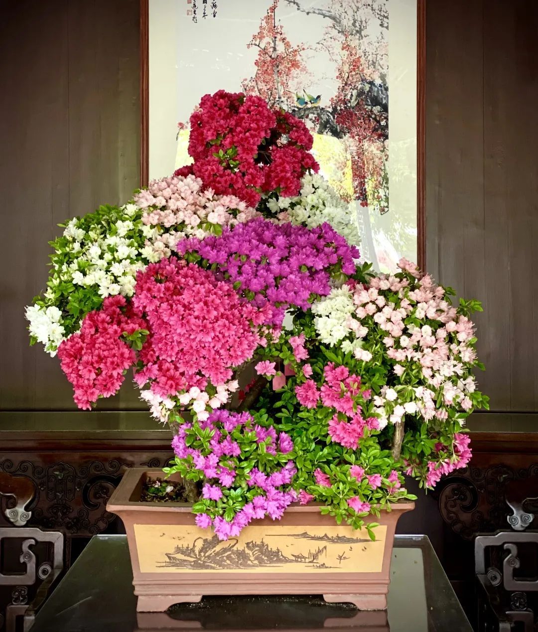 厅堂内主要以精品杜鹃盆景展示为主,展出的精品盆景苍干虬枝、古朴典雅,一树多色。造型风格既借鉴了苏派、杨派及岭南派盆景的优点,又博采众长,突出自然为上。