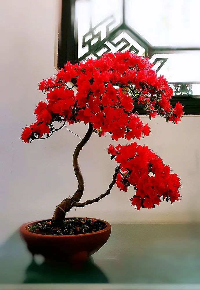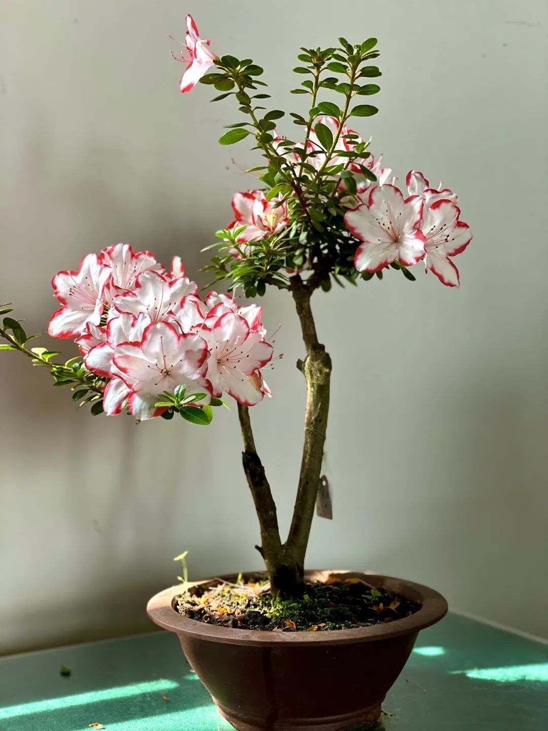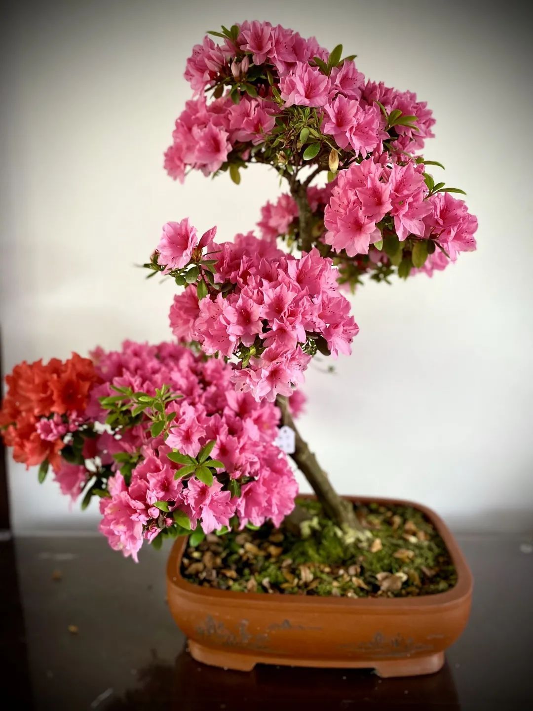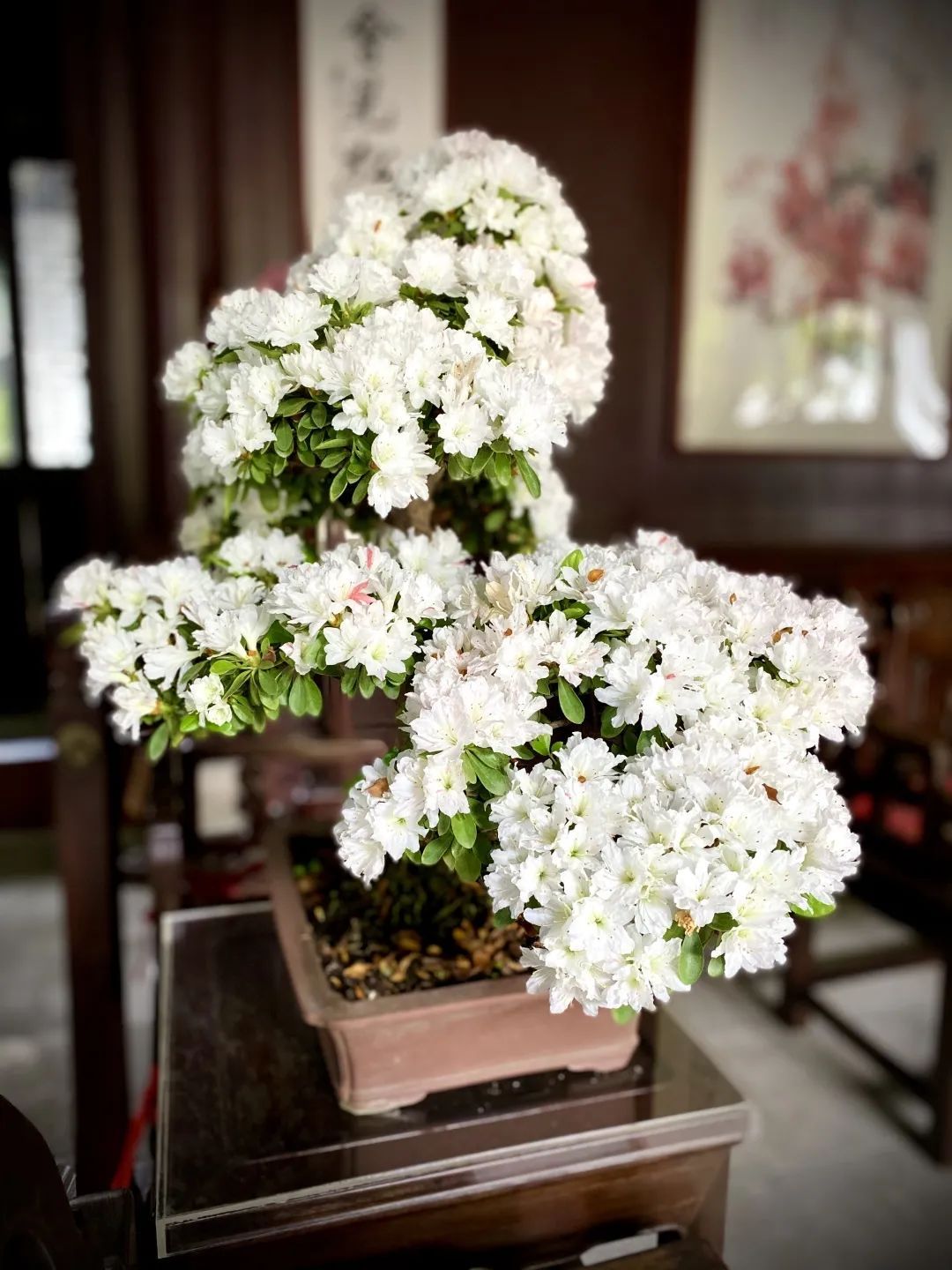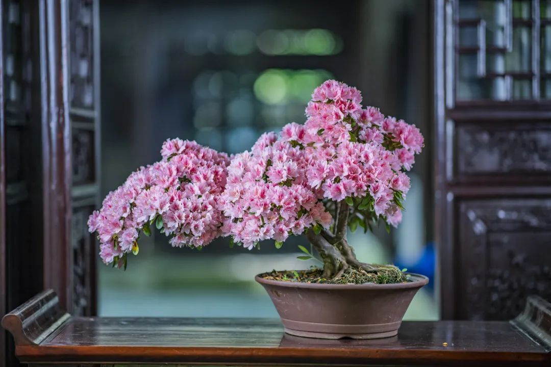 厅堂内主要以精品杜鹃盆景展示为主,展出的精品盆景苍干虬枝、古朴典雅,一树多色。造型风格既借鉴了苏派、杨派及岭南派盆景的优点,又博采众长,突出自然为上。