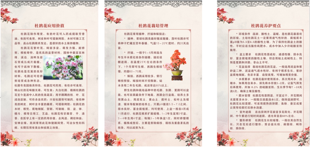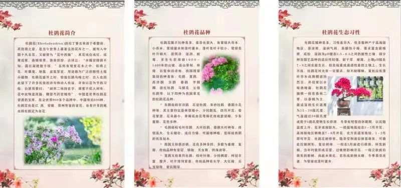 通过展板形式向广大市民游客介绍杜鹃品种、栽培工艺、药用价值等相关知识,进一步增进市民对我国传统杜鹃文化的了解。