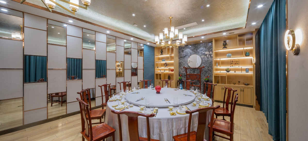 煌佳私宴总面积达1500多平方米,设计风格以淡雅的江南风韵为主题,共设有12个高雅别致的包厢,包厢的名字来自于“龙凤呈祥”,“兴盛安泰”,包厢内摆放的艺术装饰品与各包厢主题风格相吻合,一桌一椅尽显江南诗意。