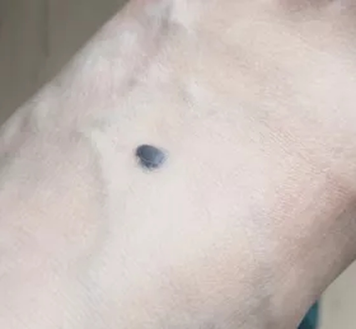 女,37岁,左脚脚背六七年前长了一颗痣,短时间内长大比较快,然后就没再长了。凸起,颜色黑蓝色,不痛不痒。