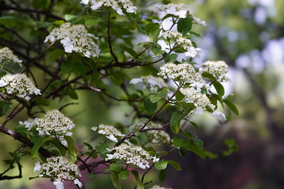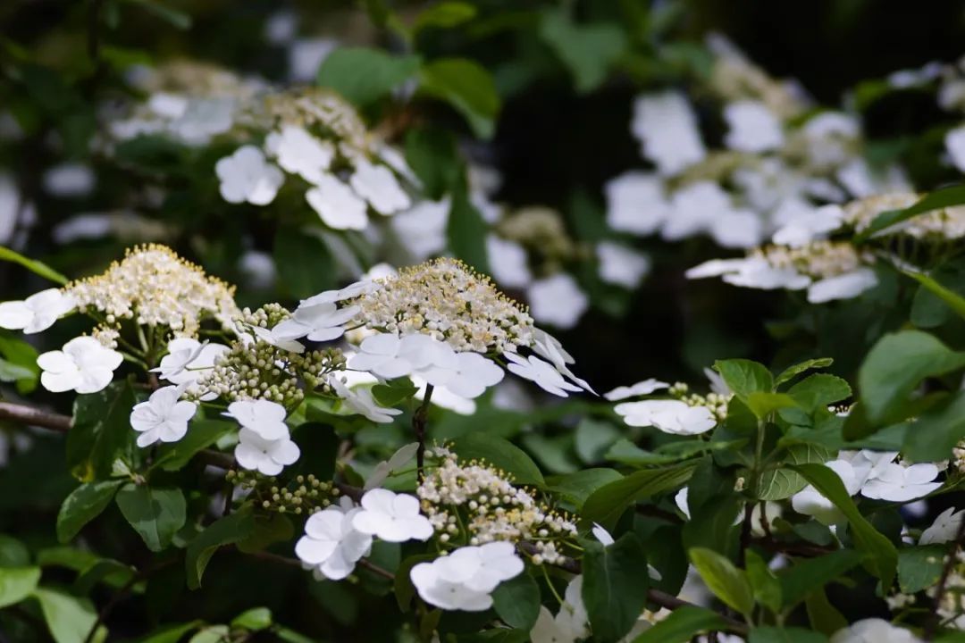 在小草坪周边的琼花聚集区,多数琼花树正玉花满缀,微风轻拂,琼花摇曳如蝴蝶戏珠,无风时又似八仙起舞,远观好似瑞雪覆盖,流光溢彩。