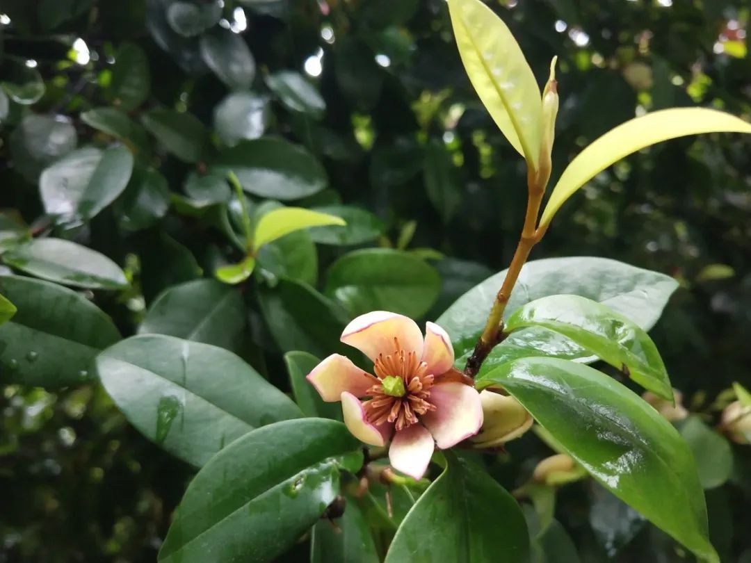 就说顽石斋门前的含笑,作为常绿的灌木,它算是高大的了。含笑是木兰科含笑属的常绿芳香花木,花着生在叶腋,但却和玉兰一样直立,6瓣花虽小但苞润如玉、肉质肥厚,发出甜浓的香味,美形于香。还有一株生长在幽篁烟月廊道最北缘,隔着墙、透过窗就能闻见那股沁人心脾的甜香,转个弯进来才发现,原来是含笑这娇羞的小花!
