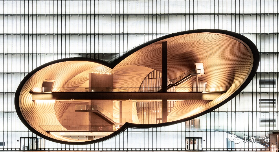 东方艺术中心从位于建筑中心的圆点出发,向四周发散成5个大小不一的“花瓣”半球体,总体形成墨绿色的碗状造型。夜幕下,呈现为一朵“蝴蝶兰”。
