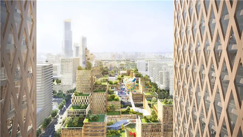在基地南侧营造适应年轻人新生活方式的年轻邻里,打造面向双创青年便捷配套的蜂族社区与面向高知家庭全额配套的幸福社区;设置空中自行车道解决近域通勤问题;结合地铁、BRT与智慧公交构成的公共交通体系,鼓励低碳出行。