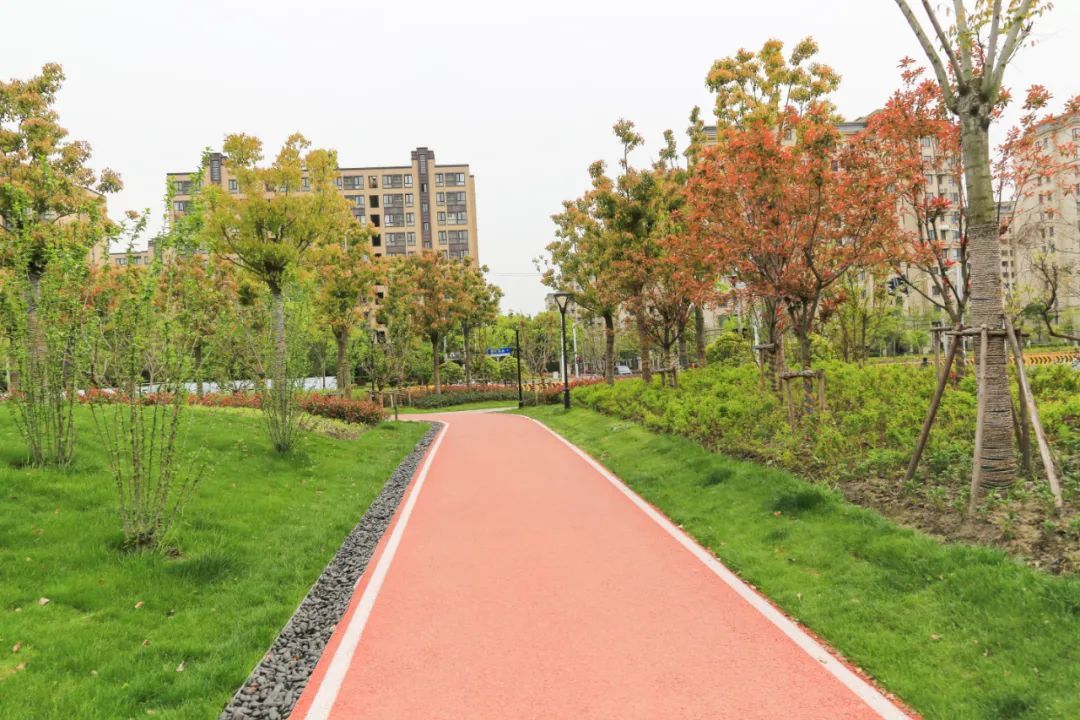 近日,小松在永丰街道仓轩路荣乐西路路口的仓轩路休闲绿地里看到,新建成的健身步道宛若一条“红地毯”镶嵌在绿地中,成为了附近居民休闲、锻炼的好去处。