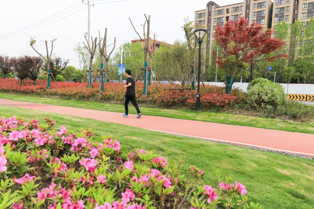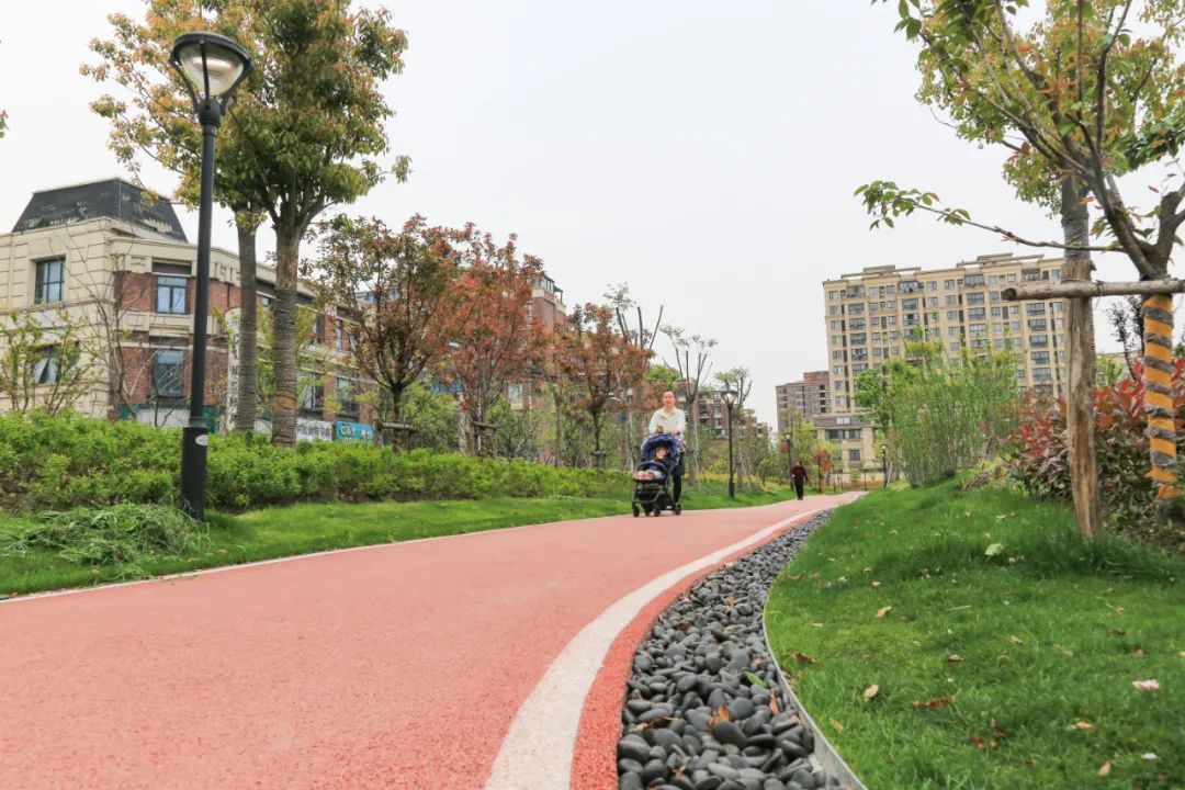 绿地内的步道让居民一路赏心悦目,而一批沿河步道的建设则成为了居民多样性的滨水空间。洞泾镇海欣城新世纪家园小区内,300米长的滨水健身步道旁,还配套有4000平方米可进入式草坪及小广场,集观赏、休憩放松、体育健身于一体。