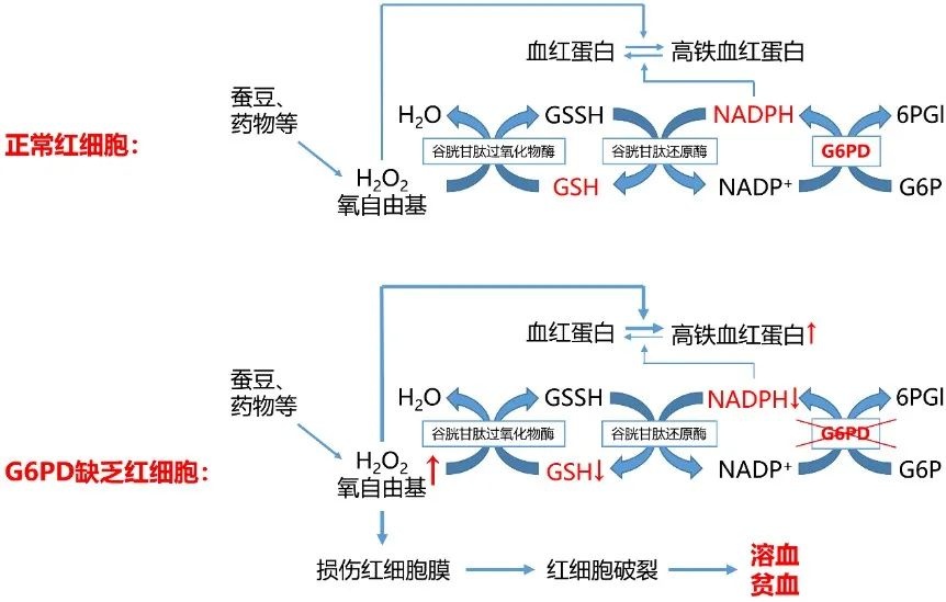 图:正常红细胞和G6PD缺乏红细胞受到氧自由基损伤时的示意图。