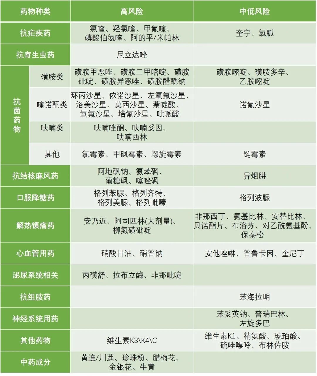 下表列出了一些常见药物使用的风险情况。高风险药物在G6PD缺乏症患者中禁用;中低风险药物在常规治疗剂量范围使用时,对大部分患者是安全的,但在特殊情况如过量服用、中毒、药物联合使用等可能有增加溶血发生风险,应当在医师指导下应用。
