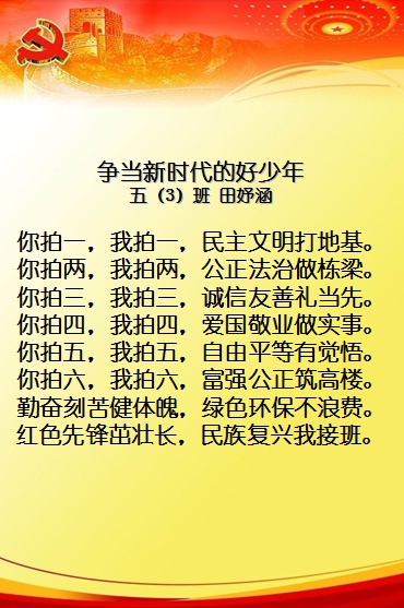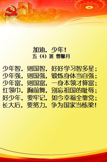 以童谣抒情,以文字润心,一首首朗朗上口的童谣,表达了同学们爱党爱国的思想情感,树立了要从小努力学习,长大为祖国的发展做出自己贡献的坚定信念。