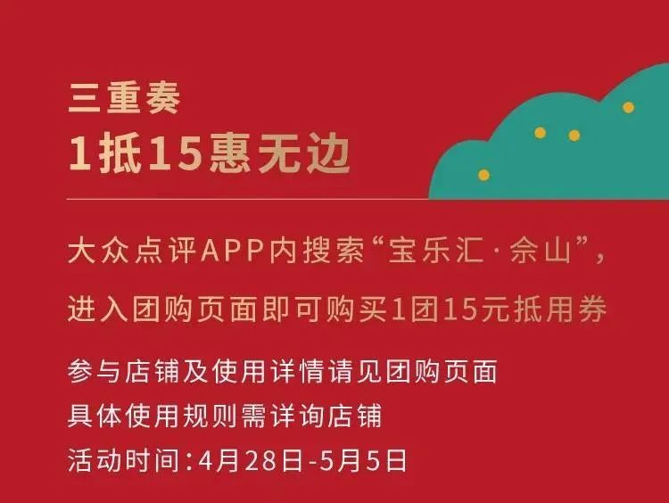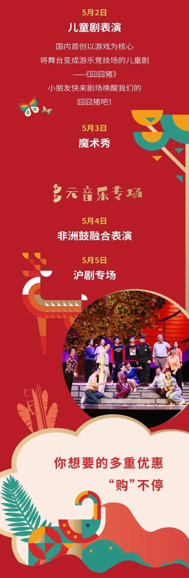4月28日-5月5日每天13:00-15:00,商场一楼中庭都将开展丰富多彩的活动。除了能看到精彩的非遗演出、民乐表演等,商场还将在开业当天发放无门槛抵用券。划重点!抵用券可与商家优惠叠加使用!