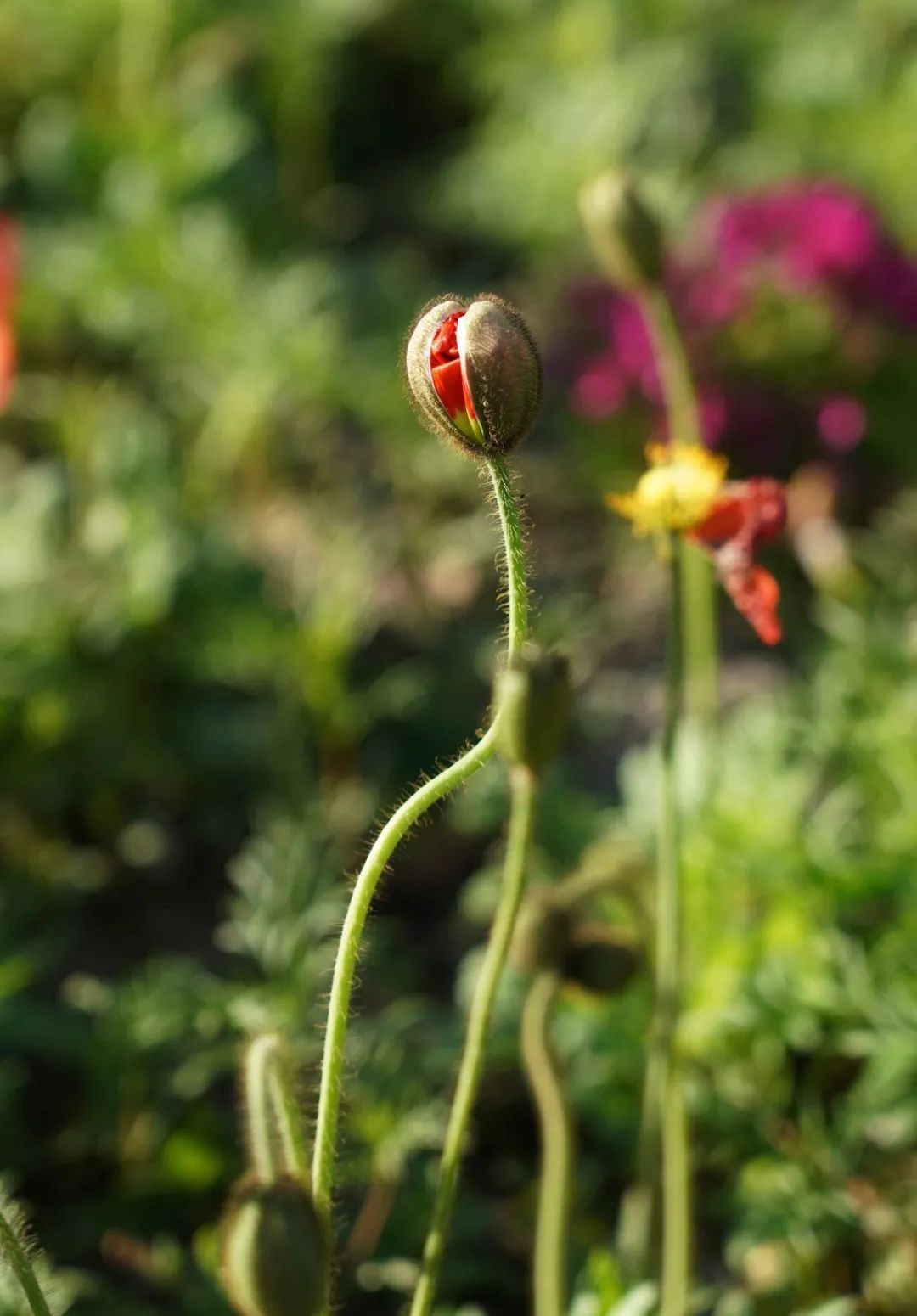 它的花苞也很有趣,花未开时倒垂着呈椭圆形,上面还包裹着一层毛茸茸的刚毛,十分可爱。
