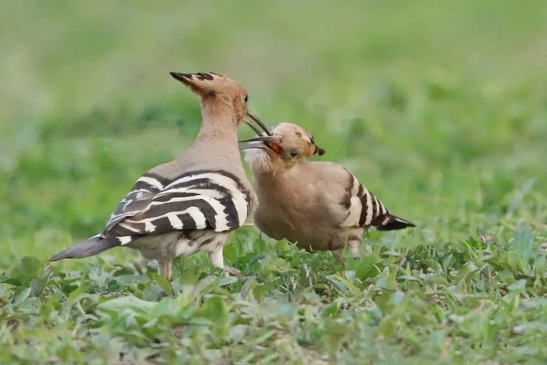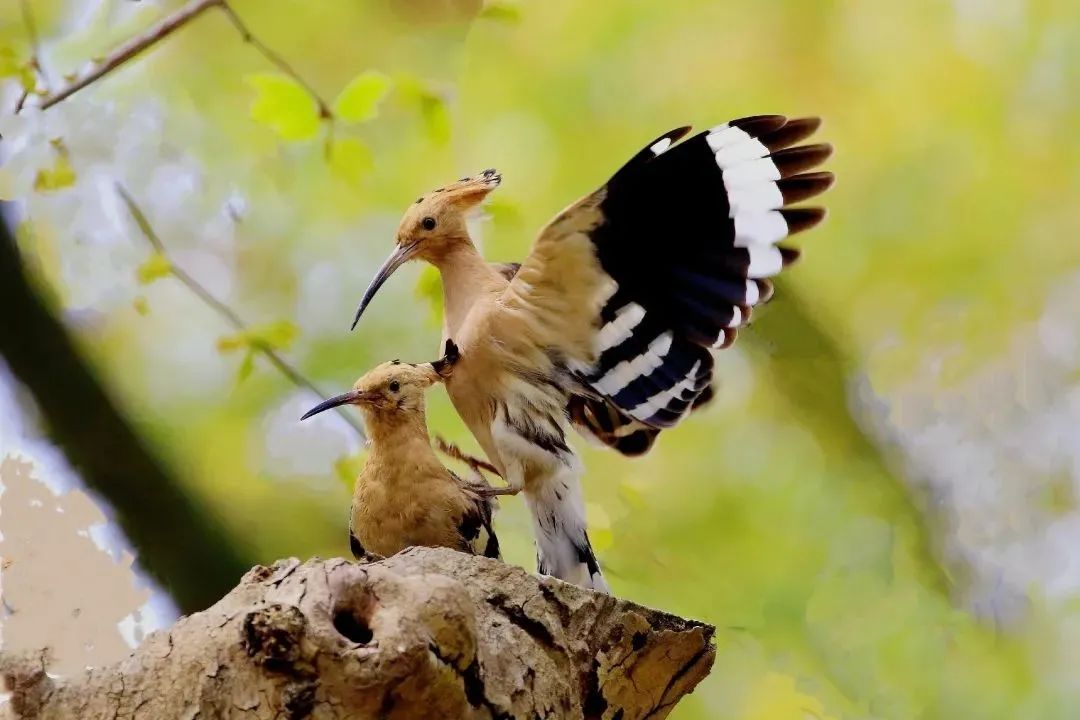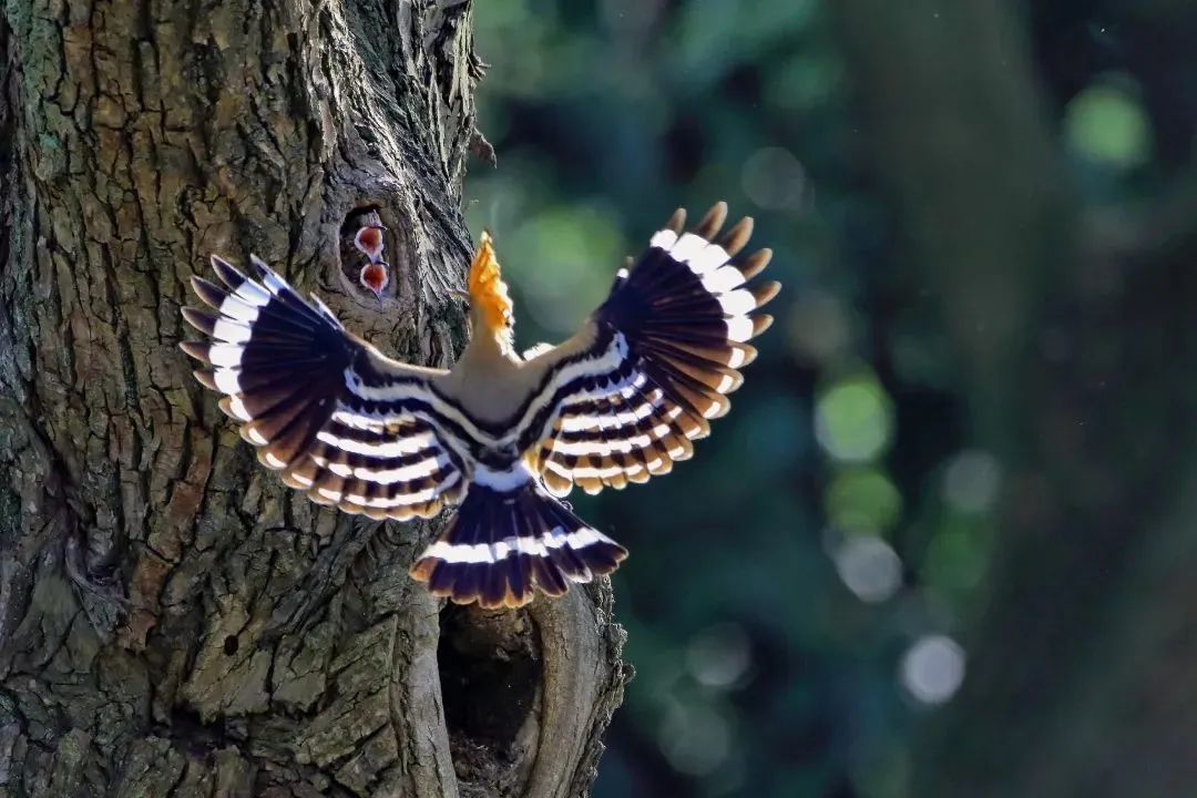 戴胜的姿态很美,尤其是头冠打开时非常好看。当小鸟长大些后,会在洞口争食,红色的小嘴巴张开,十分有趣。