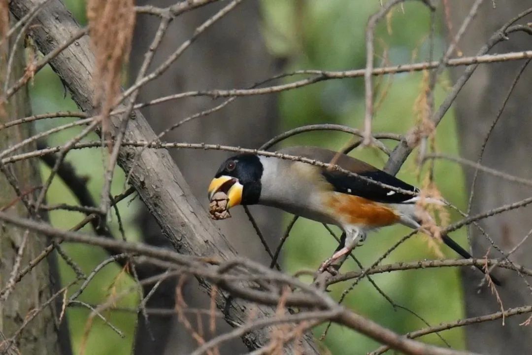 坚硬的果壳在它们嘴里如同棉花糖一样松软,嘴的颜色蜡黄似铜色,叫它“铁齿铜嘴”也不为过。黑尾蜡嘴雀是雀科,通常出现在果园、城市公园以及农田地边。性格活泼大胆,偶尔还会找果民伯伯“聊聊天,说说话”。它们的鸣叫声很是好听,悠扬欢快。