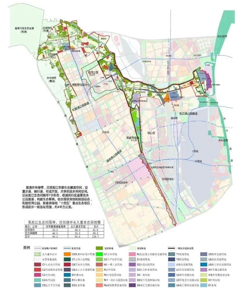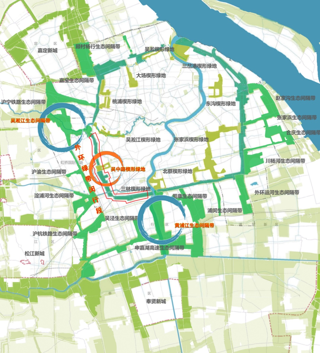 “环外”,在闵行区域,分别为总规划面积9.65平方公里的吴淞江生态间隔带和总规划面积24.69平方公里的黄浦江生态间隔带。