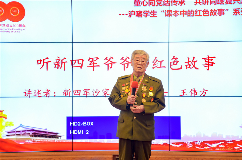 在当天举行的“童心向党话传承,共讲同绘复兴路”沪喀学生“课本中的红色故事”系列活动启动仪式上,沪喀两地师生分别通过情景剧、歌曲、舞蹈等表演,共同表达爱党、爱国的深厚情怀。大家还怀着敬仰的心情,聆听新四军老英雄王伟方爷爷讲述英勇抗敌,保家卫国的故事。随后,学生代表发出“课本中的红色故事”活动倡议,号召沪喀两地学生以“课本中的红色故事”为文本,争做红色故事的传播者,红色基因的传承者。