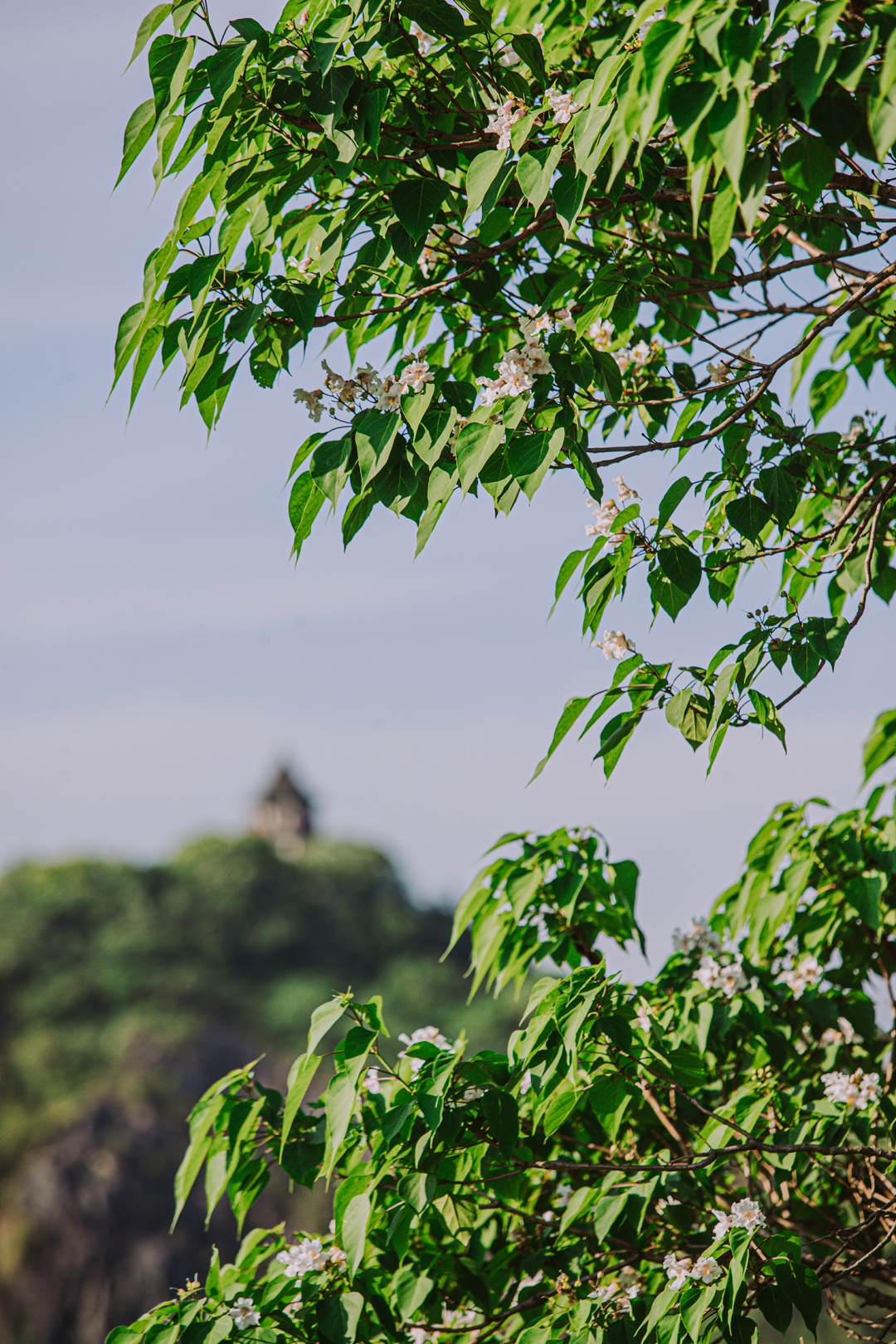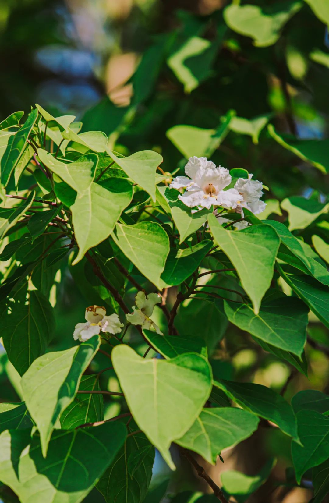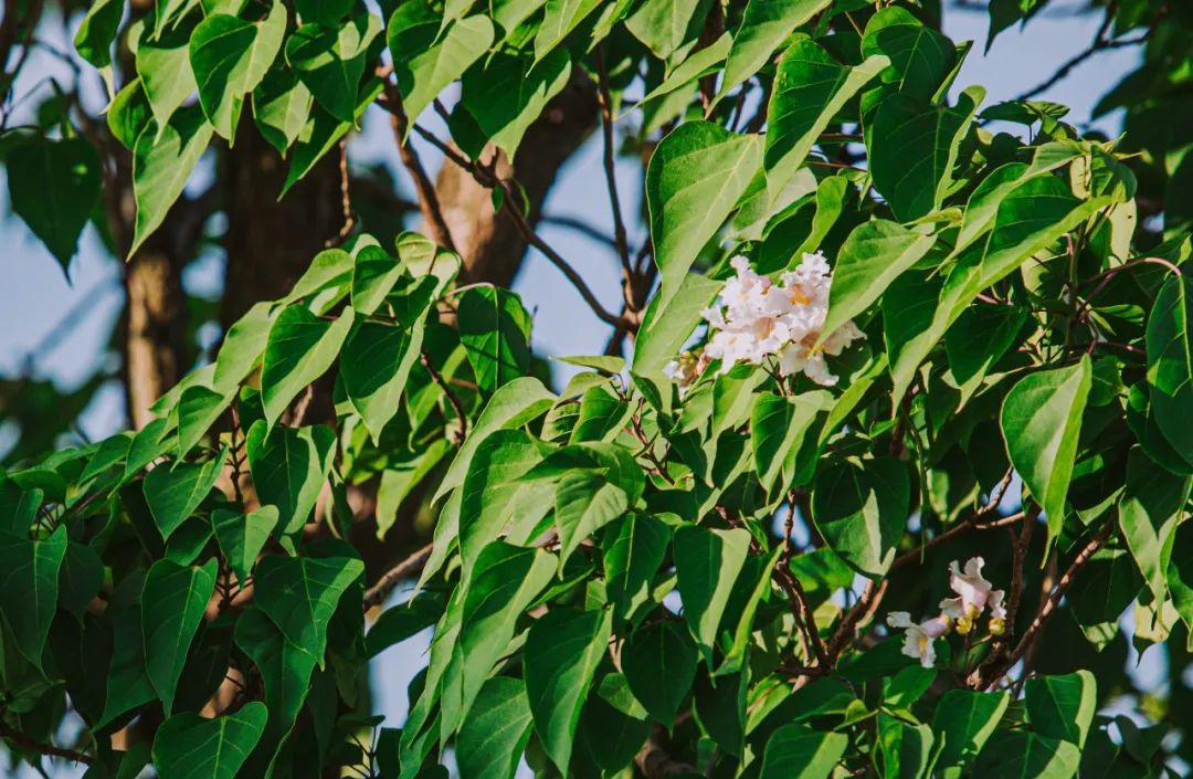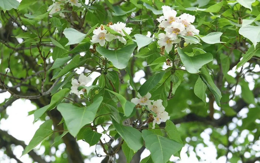 最近,这些黄金树的叶丛中,绽开了一朵朵直径约5-6厘米,白底而带有紫色斑点、黄色条纹的精致花朵,犹如一个个小精灵在叶丛中眨着大眼睛,好奇地观察着外面的世界。