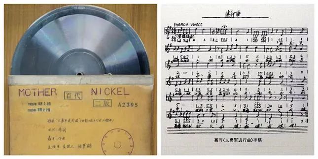 同年5月3日,在百代小楼的录音棚内,上海电通公司七人合唱队袁牧之、顾梦鹤、盛家伦、郑君里、金山、施超、司徒慧敏等演唱《义勇军进行曲》并灌制成唱片。资料显示,母版唱片编号A2395,随后被转录到影片《风云儿女》胶片上,5月24日在上海首映。7月,首版《义勇军进行曲》唱片由百代唱片公司出版,唱片编号34848b。