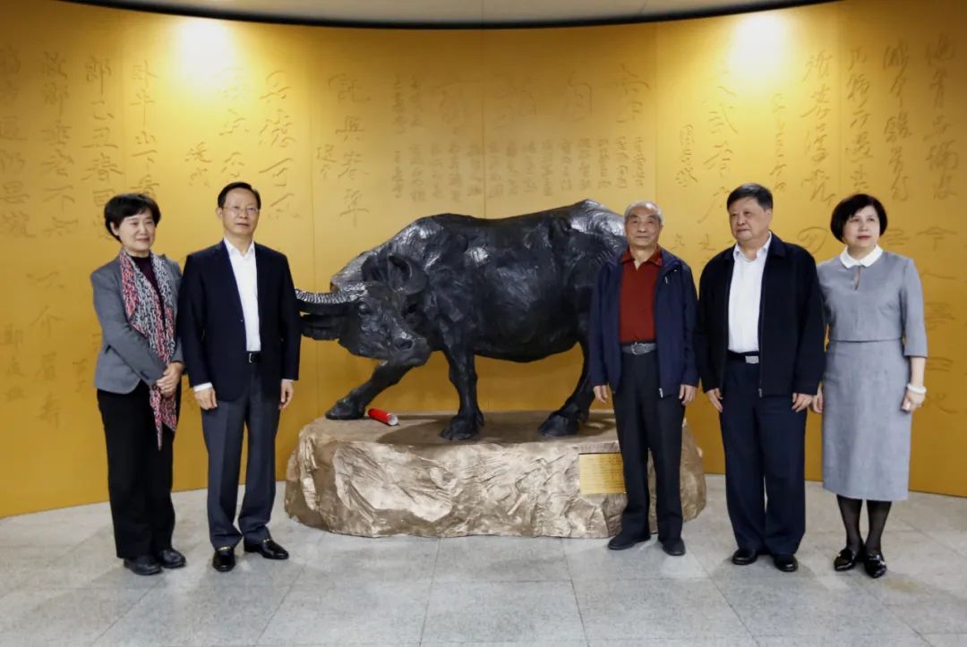 汪观清与俞光耀(左二)、赵英(左一)、童世平(右二)、费俭(右一)为“大武有力”铜牛雕塑揭幕
