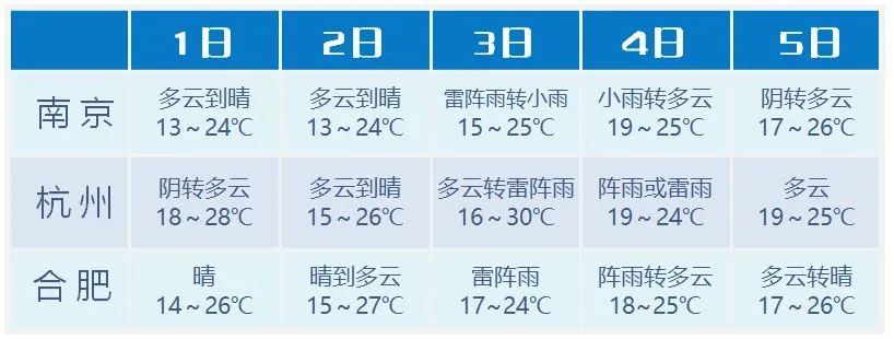 长三角地区4月30日有雷雨大风天气;5月1~2日以多云天气为主,5月3~4日受低涡东移影响,有一次降水过程。极端最高气温29~30℃。