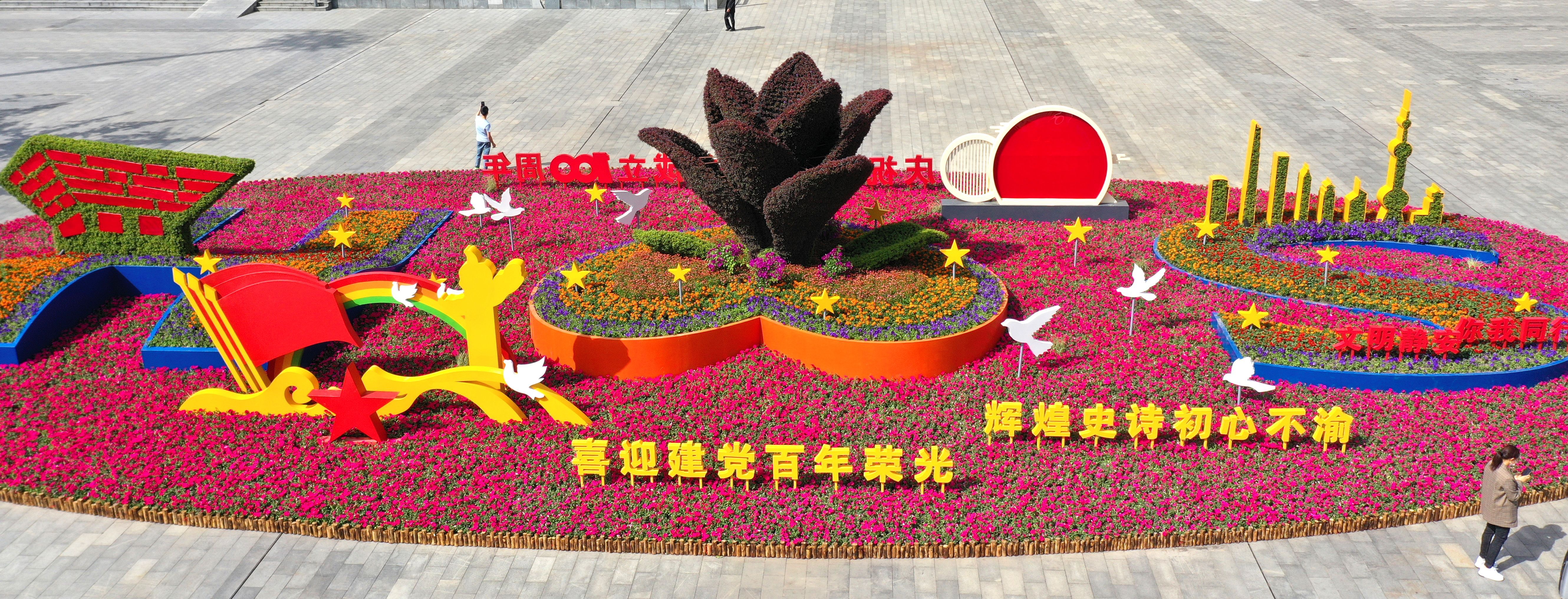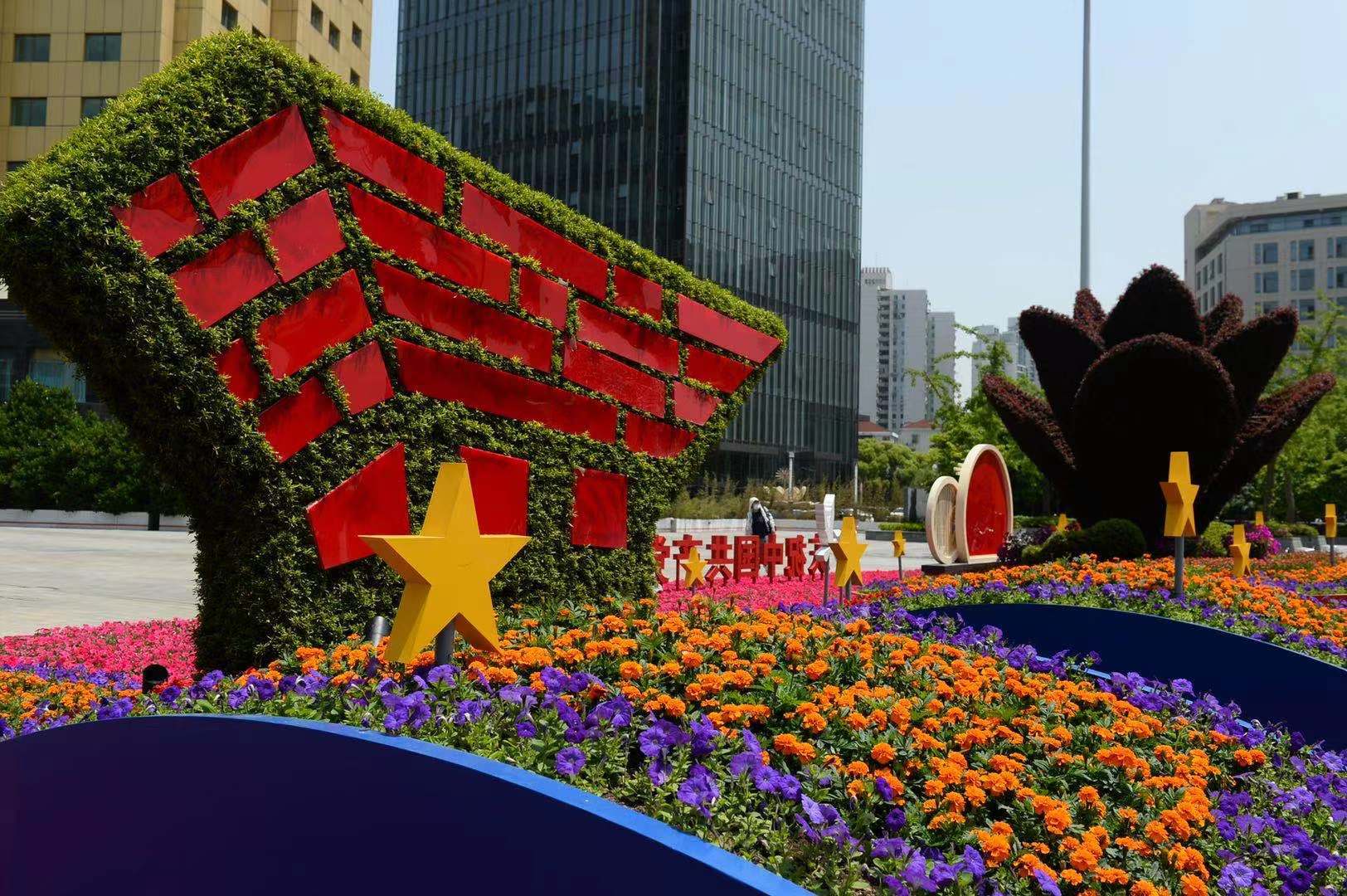 记者看到,该立体花坛正面放置“庆祝中国共产党成立100周年”红色字样,一旁搭配社会主义核心价值观宣传牌;另一面放置宣传标语“喜迎建党百年荣光、辉煌史诗初心不渝”黄色字样和“文明静安、你我同行”红色字样。设计师汤志丹告诉记者,“华表、国旗、五角星、彩虹”的组合元素,寓意着中华民族社稷永固、源远流长;散置19颗黄色“五角星”寓意党的19次代表大会;飞翔的“和平鸽”象征着新时代中国特色社会主义蒸蒸日上。