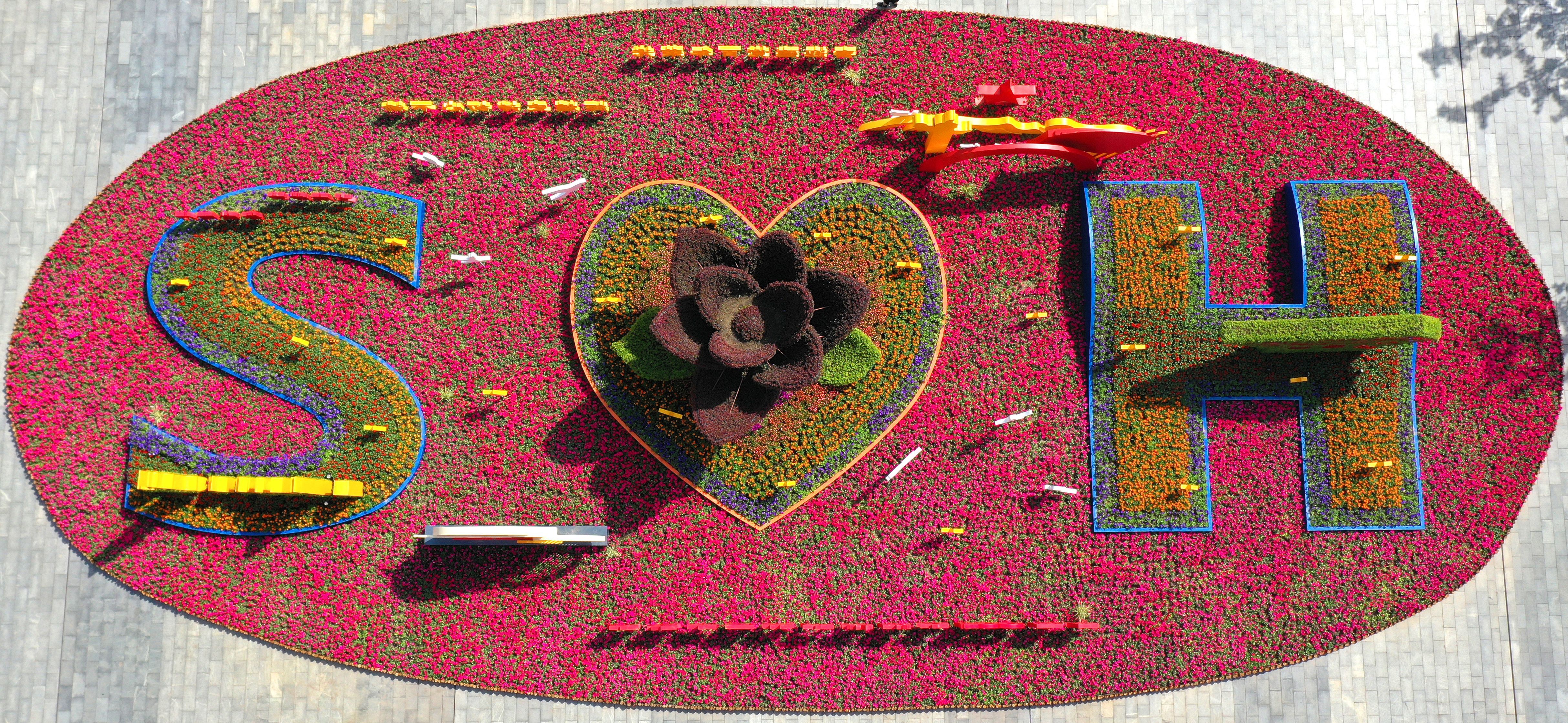 静安绿化管理部门介绍说,该立体花坛从施工到建成仅用时一周,如此大型的庆祝建党百年的主题花坛,在全市范围内也不多见。该立体花坛布局由“S”“心型”“H”组成,寓意“爱上海”。“S型”花坛里设置“外滩”缩影的绿雕;“心型”花坛内设置的上海市市花白玉兰绿雕;“H”型花坛里设置“中国馆”缩影的绿雕,花坛内搭配种植草花,绿雕上种植红绿草。