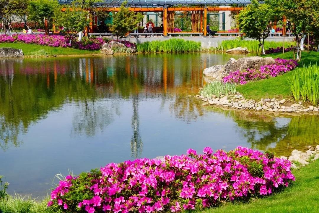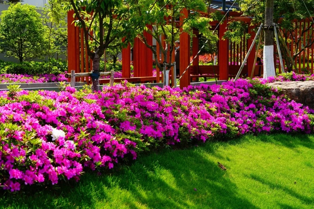 彭浦四季公园以春夏秋冬四季为主题,春园和夏园内均种植了不少杜鹃,一团团、一簇簇娇艳烂漫的杜鹃花绽放,远远望去,仿佛给公园涂上了胭脂。杜鹃又名映山红、山石榴。相传,古有杜鹃鸟,日夜哀鸣而咯血,染红遍山的花朵,因而得名。